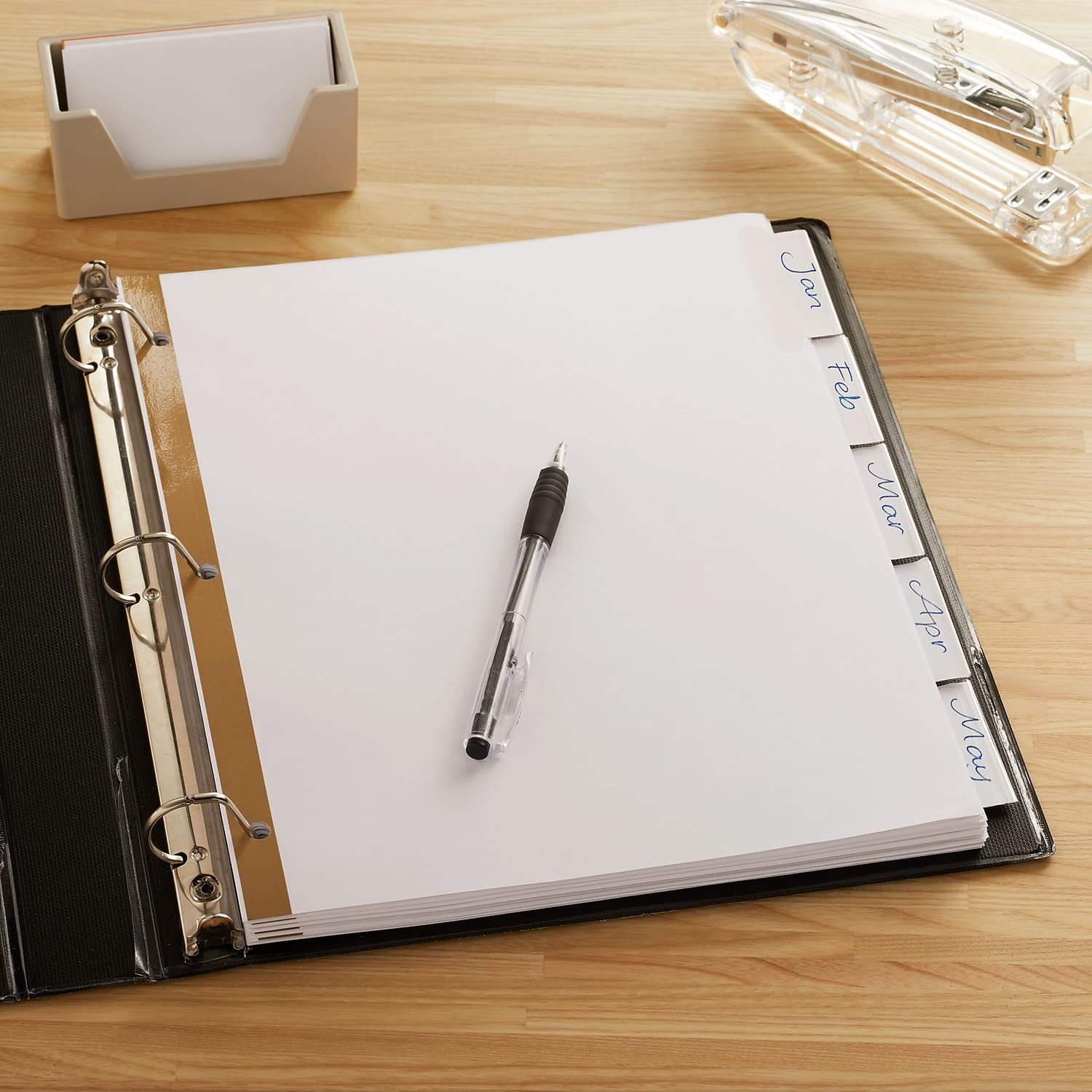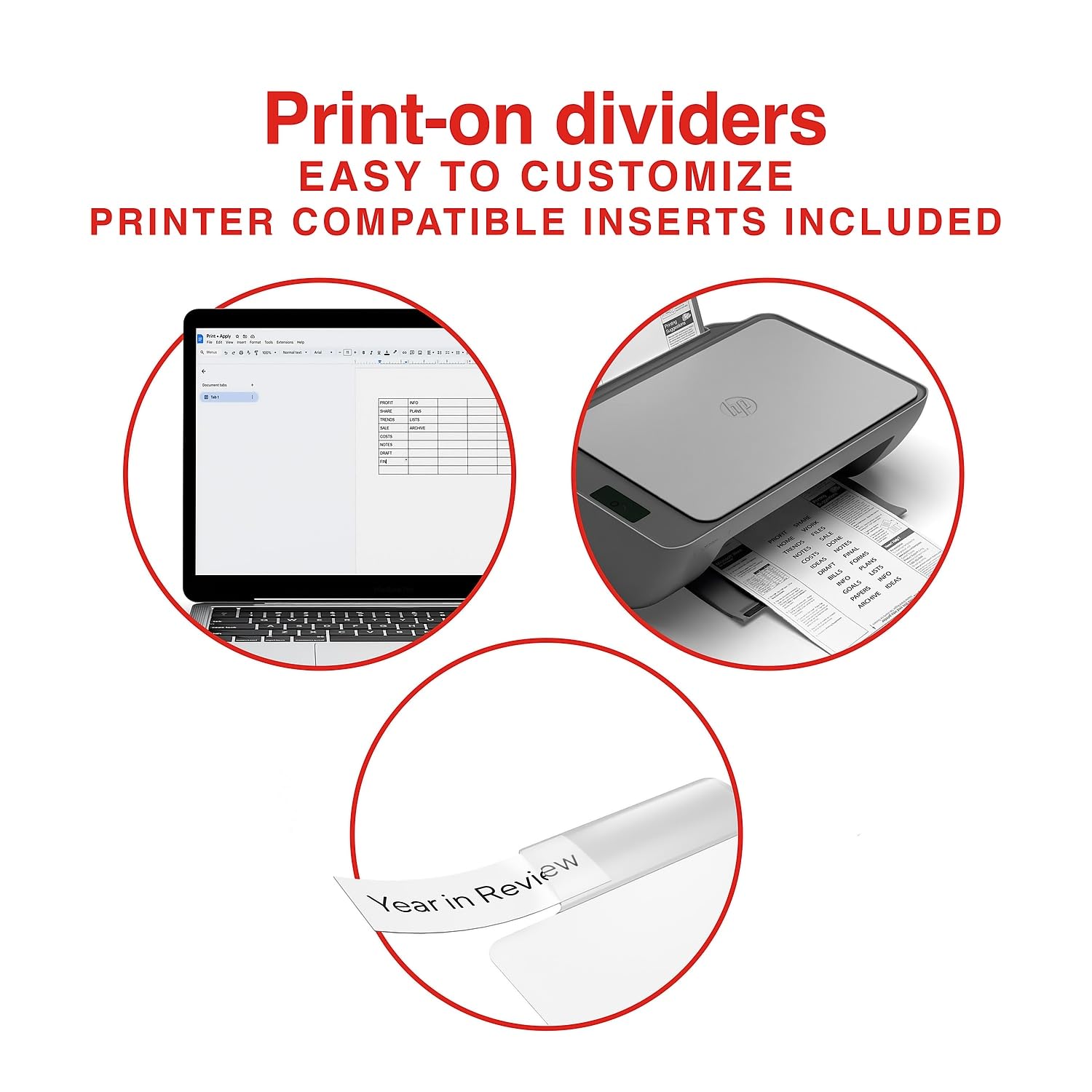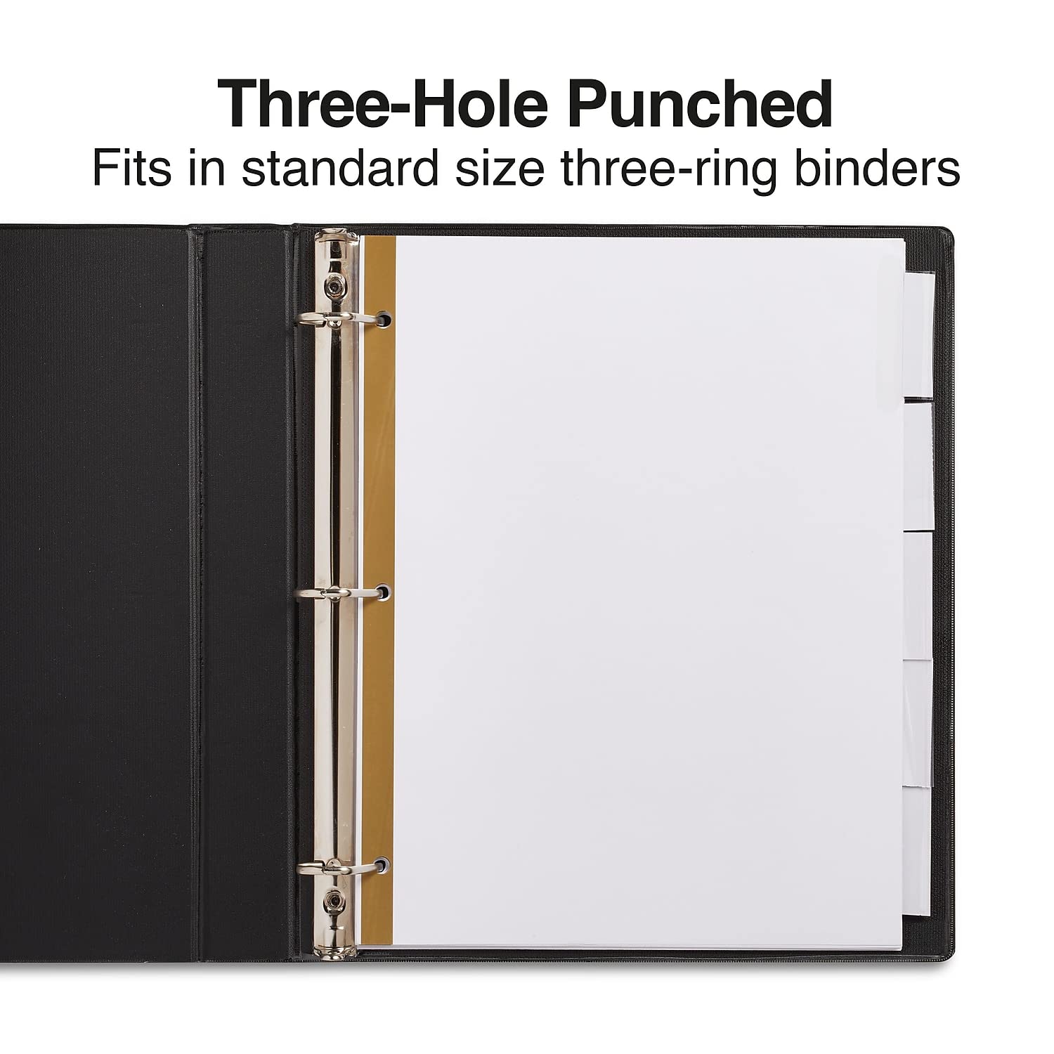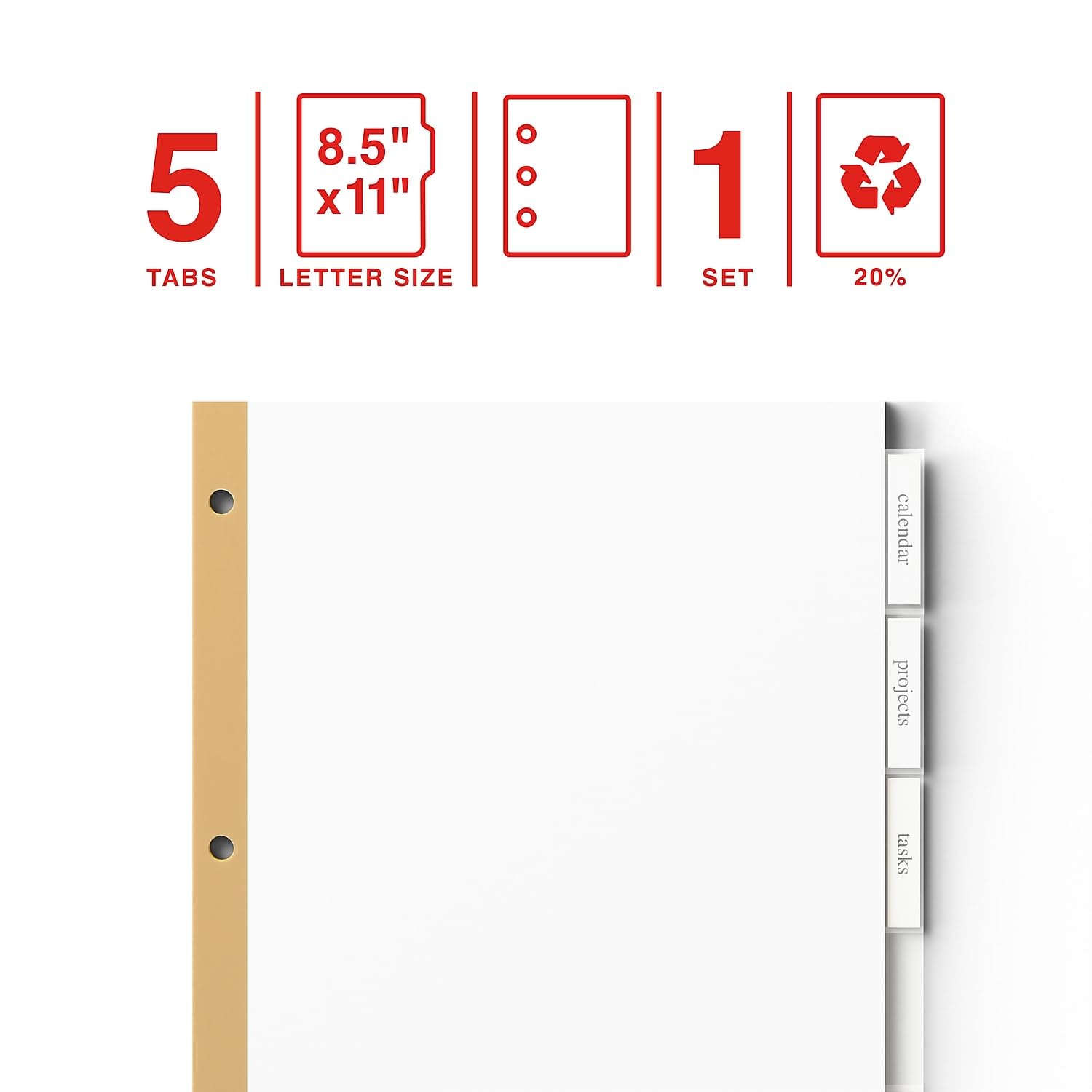 • Tab dividers let you organize projects, personal documents, and more. Made of white paper with clear tabs. Dimensions: 8.5″W x 11″L. Five-tab set of three-hole punched dividers. Tear-resistant tabs for long-term use. Five inserts are included, insert layouts compatible with Microsoft Word, WordPerfect, and more. Made from 20% post-consumer recycled material.