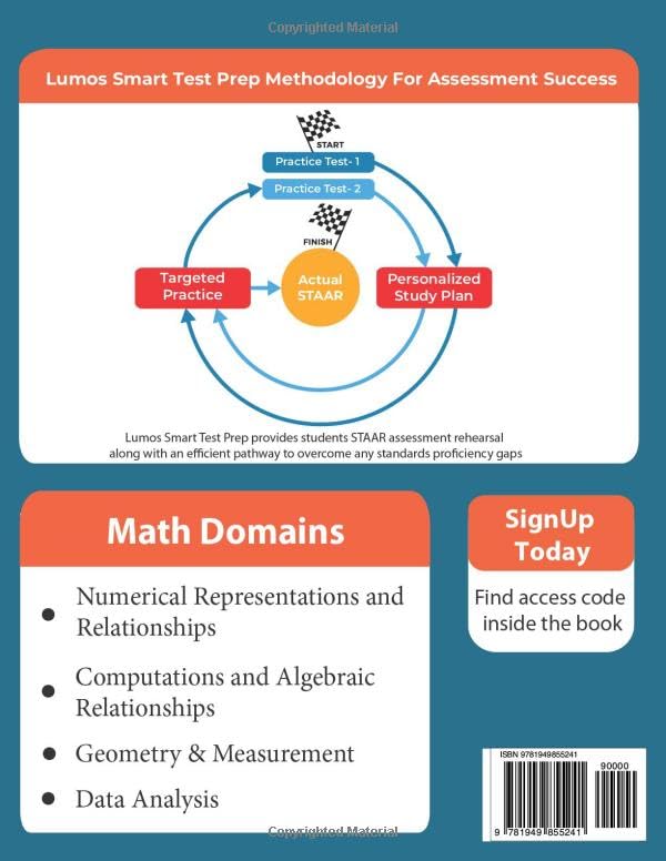 Give Your Child an Edge on the 2025 STAAR! Prepare them to excel in the Texas state assessments with confidence and ease. Designed by STAAR experts, the Lumos Learning 5th Grade Math Practice Workbook is crafted to boost your child’s test scores by 10-15 points. Featuring hundreds of practice questions fully aligned with Texas TEKS standards, realistic online practice tests, and personalized learning paths, this workbook is tailored to your child’s needs. What’s New in the 2024-25 Lumos STAAR Grade 5 Math Workbook? Introducing Lumos AI Tutor: Get personalized guided support with step-by-step explanations, helpful hints, and tailored feedback–just like having a teacher at home! Try it today with your workbook. Comprehensive STAAR Prep with 5th Grade Math Practice Questions Expert-Designed Practice: Hundreds of carefully crafted questions aligned with the STAAR test, available in both print and digital formats, covering every essential math concept. Comprehensive Coverage: The workbook addresses 25+ math skills, including Numerical Representations and Relationships, Computations and Algebraic Relationships, Geometry & Measurement, and Data Analysis. Realistic Practice Tests: Prepare your child with two full-length practice tests that mirror the exact format and difficulty level of the STAAR exam, helping them build confidence for test day. Personalized Study Plan: Based on your child’s performance in the online practice tests, receive a personalized study plan, guiding them through targeted remedial practice using the physical workbook. Lumos AI Tutor: Acting as a personal coach, the AI Tutor provides step-by-step guidance, hints, and real-time feedback to keep your child on track and engaged during practice. Progress Tracking: Compare your child’s progress with their peers using easy-to-read performance reports, allowing you to address any learning gaps early. Exclusive Print & Digital Resources What’s Included in the Printed Workbook? Four chapters covering all Texas Math standards Answer keys with detailed explanations Exclusive Online Resources Two full-length practice tests mirroring the 2025 STAAR exam Personalized study plans for targeted remedial practice Engaging test prep resources such as guided practice questions, solved examples, videos, mind maps, flashcubes, and more A user-friendly dashboard with detailed performance reports Lumos AI Tutor for personalized support during practice Why Parents Trust Lumos tedBook for Texas State Tests With over 17 years of experience, Lumos Learning has helped more than 1.3 million students, 164,600 teachers, and 58,100 schools improve their test outcomes. Our Smart Test Prep Methodology ensures your child is fully prepared for the 2025 STAAR. A Workbook Designed for Year-Round Learning Whether for classroom instruction, at-home practice, homeschooling, or tutoring, the Lumos STAAR Math Workbook provides an engaging and effective way to prepare for the Texas state tests. Don’t wait–give your child the advantage they need for the 2025 STAAR with the Lumos tedBook. Order today and start preparing for success!