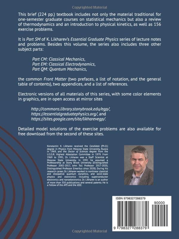 This brief (224 pp.) textbook includes not only the material traditional for one-semester graduate courses on statistical mechanics (physical statistics basics, ideal and not-so-ideal classical and quantum gases, phase transitions, and fluctuations) but also a review of thermodynamics and an introduction to physical kinetics, as well as 156 exercise problems. It is Part SM of K. Likharev’s Essential Graduate Physics series of lecture notes and problems. Besides this volume, the series also includes three other subject parts: Part CM: Classical Mechanics, Part EM: Classical Electrodynamics, Part QM: Quantum Mechanics, the common Front Matter (two prefaces, a list of notation, and the general table of contents), two appendices, and a list of references. Electronic versions of all materials of this series, with some color elements in graphics, are in open access at mirror sites http://commons.library.stonybrook.edu/egp/, https://essentialgraduatephysics.org/, and https://sites.google.com/site/likharevegp/. Detailed model solutions of the exercise problems are also available for free download from the second of these sites. About the author: Konstantin K. Likharev received the Candidate (Ph.D.) degree in Physics from Moscow State University, Russia in 1969, and the Doctor of Sciences degree from the U.S.S.R. Highest Attestation Committee in 1979. From 1969 to 1991, Dr. Likharev was a Staff Scientist at Moscow State University. In 1991 he assumed a Professorship at Stony Brook University (Distinguished Professor 2002-2017, John Toll Professor 2017-2020, Distinguished Professor Emeritus since 2020). During his research career, Dr. Likharev worked in the fields of nonlinear classical and dissipative quantum dynamics, and solid-state physics and electronics including superconductor electronics and nanoelectronics. Dr. Likharev is an author of more than 350 publications and several patents. He is a Fellow of the APS and the IEEE.