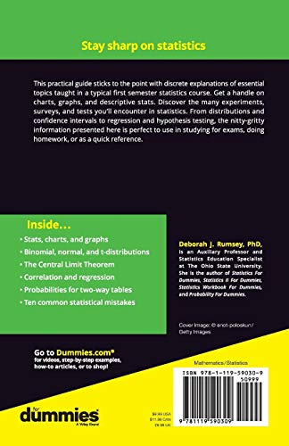 Statistics Essentials For Dummies (9781119590309) was previously published as Statistics Essentials For Dummies (9780470618394). While this version features a new Dummies cover and design, the content is the same as the prior release and should not be considered a new or updated product. Statistics Essentials For Dummies not only provides students enrolled in Statistics I with an excellent high-level overview of key concepts, but it also serves as a reference or refresher for students in upper-level statistics courses. Free of review and ramp-up material, Statistics Essentials For Dummies sticks to the point, with content focused on key course topics only. It provides discrete explanations of essential concepts taught in a typical first semester college-level statistics course, from odds and error margins to confidence intervals and conclusions. This guide is also a perfect reference for parents who need to review critical statistics concepts as they help high school students with homework assignments, as well as for adult learners headed back into the classroom who just need a refresher of the core concepts. The Essentials For Dummies Series Dummies is proud to present our new series, The Essentials For Dummies. Now students who are prepping for exams, preparing to study new material, or who just need a refresher can have a concise, easy-to-understand review guide that covers an entire course by concentrating solely on the most important concepts. From algebra and chemistry to grammar and Spanish, our expert authors focus on the skills students most need to succeed in a subject.