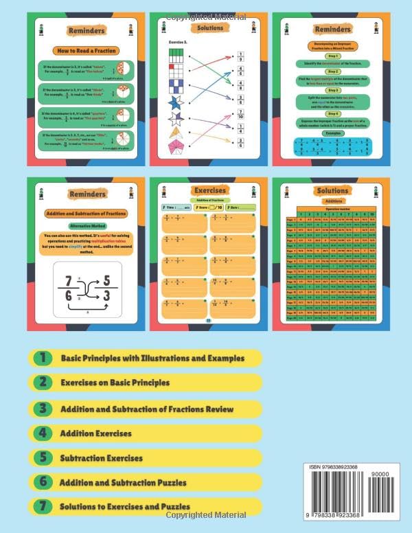 What You’ll Find Inside: 1 Basic Principles with Illustrations and Examples Clear explanations accompanied by vibrant illustrations to help you grasp the fundamentals of fractions. 2 Exercises on Basic Principles Strengthen your understanding of core concepts with exercises specifically designed to reinforce your learning. 3 Addition and Subtraction of Fractions Review Revisit how to add and subtract fractions with essential reminders and tips. 4 Addition Exercises Progressively master the addition of fractions with a variety of fun and challenging exercises. 5 Subtraction Exercises Hone your subtraction skills with tailored exercises designed to help you excel. 6 Addition and Subtraction Puzzles Sharpen your problem-solving abilities with captivating puzzles that challenge your grasp on fraction concepts. 7 Solutions for Exercises and Puzzles Find all the solutions at the end, allowing you to check your answers and learn from any mistakes. Why Choose This Workbook? Colorful and Engaging Illustrations The book contains colorful illustrations to help you understand fractions. Track Your Progress Mark your scores and time spent on each page, allowing you to follow your improvement as you advance. Essential Reminders Review key concepts like proper, improper, and mixed fractions with clear and simple explanations. Captivating Puzzles Boost your thinking skills with fun, challenging puzzles that make learning fractions an enjoyable experience. This workbook is the perfect companion for young learners aiming to master fractions while having fun with engaging exercises and puzzles!