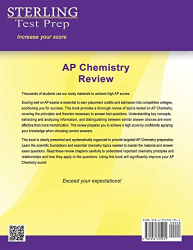 Recommended by teachers. Trusted by students. Higher score guarantee! Thousands of students use Sterling Test Prep to achieve high test scores! Thorough coverage of topics tested on AP Chemistry. This text is clearly presented and systematically organized to provide targeted AP Chemistry preparation. Learn the scientific foundations and essential chemistry topics needed to master the material and answer exam questions. These review chapters teach important chemistry principles and relationships and how they apply to questions. Scoring well on AP exams is essential to earn placement credits and admission into competitive colleges, positioning you for success. This book provides a thorough review of topics tested on AP Chemistry, covering the principles and theories necessary to answer test questions. Understanding key concepts, extracting and analyzing information, and distinguishing between similar answer choices are more effective than mere memorization. This review prepares you to achieve a high score by confidently applying your knowledge when choosing correct answers. Experienced chemistry instructors analyzed the exam content and developed the material that builds knowledge and skills crucial for success. Our test preparation experts structured the content to match the current College Board curriculum. Using this book will significantly improve your AP Chemistry score!