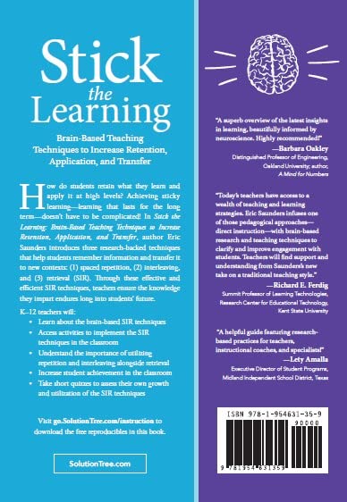 Combing through research for effective teaching strategies is a big ask for busy educators. This concise guide bridges brain-based learning theory with everyday instructional practice to maximize teacher effectiveness for visible student achievement. Learn three powerful, doable techniques proven to support long-term retention: spaced repetition, interleaving, and retrieval (SIR). Explore engaging activities designed to improve student retention, application, and transfer by easily integrating SIR into your classroom. This user-friendly guide to sticky learning will help K-12 teachers Understand the SIR techniques that support a brain-compatible classroom Use activities to better implement SIR in the classroom Understand the importance of utilizing repetition and interleaving alongside retrieval Increase student achievement Reflect on their own growth and success in implementing SIR techniques Contents: Introduction Chapter 1: An Overview of the SIR Techniques Chapter 2: Spaced Repetition Chapter 3: Interleaving Chapter 4: Retrieval Chapter 5: The SIR Quick Start Guide Epilogue Appendix: Frequently Asked Questions References and Resources Index