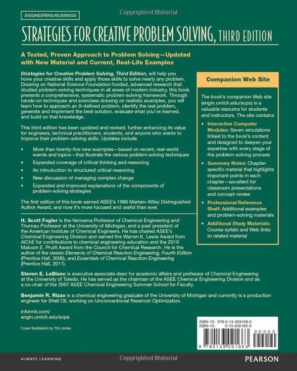 A Tested, Proven Approach to Problem Solving–Updated with New Material and Current, Real-Life Examples Strategies for Creative Problem Solving, Third Edition, will help you hone your creative skills and apply those skills to solve nearly any problem. Drawing on National Science Foundation-funded, advanced research that studied problem-solving techniques in all areas of modern industry, this book presents a comprehensive, systematic problem-solving framework. Through hands-on techniques and exercises drawing on realistic examples, you will learn how to approach an ill-defined problem, identify the real problem, generate and implement the best solution, evaluate what you’ve learned, and build on that knowledge. This third edition has been updated and revised, further enhancing its value for engineers, technical practitioners, students, and anyone who wants to improve their problem-solving skills. Updates include More than twenty-five new examples–based on recent, real-world events and topics–that illustrate the various problem-solving techniques Expanded coverage of critical thinking and reasoning An introduction to structured critical reasoning New discussion of managing complex change Expanded and improved explanations of the components of problem-solving strategies The first edition of this book earned ASEE’s 1996 Meriam-Wiley Distinguished Author Award, and now it’s more focused and useful than ever. Companion Web Site The book’s companion Web site (www.engin.umich.edu/scps) is a valuable resource for students and instructors. The site contains Interactive Computer Modules: Seven simulations linked to the book’s content and designed to deepen your expertise with every stage of the problem-solving process Summary Notes: Chapter-specific material that highlights important points in each chapter–excellent for classroom presentations and concept review Professional Reference Shelf: Additional examples and problem-solving materials Additional Study Materials: Course syllabi and Web links to related material