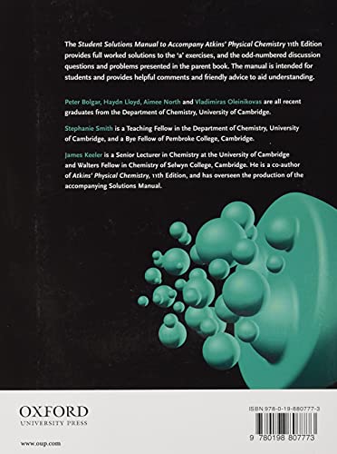 The Student Solutions Manual to accompany Atkins’ Physical Chemistry 11th Edition provides full worked solutions to the ‘a’ exercises, and the odd-numbered discussion questions and problems presented in the parent book. The manual is intended for students and provides helpful comments and friendly advice to aid understanding.