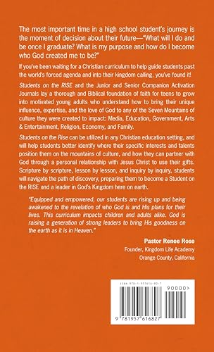The most important time in a high school student’s journey is the moment of decision about their future: “What will I do and be once I graduate?” “What is my purpose and how do I become who God created me to be?” If you’ve been waiting for a Christian curriculum to help guide students past the world’s forced agenda and into their kingdom calling, you’ve found it! This Students on the RISE Curriculum along with the Junior and Senior Companion Activation Journals, lay a thorough and Biblical foundation of faith for teens to grow into motivated young adults who understand how to bring their unique influence, expertise, and the love of God to any of the Seven Mountains of culture they were created to impact: Media, Education, Government, Arts & Entertainment, Religion, Economy, and Family. Students on the Rise can be utilized in any Christian education setting, and will help students better identify where their specific interests and talents position them on the mountains of culture–and how they can partner with God through a personal relationship with Jesus Christ to use their gifts. Scripture by scripture, lesson by lesson, and inquiry by inquiry, students will navigate the path of discovery, preparing them to become a student on the RISE, and a leader in God’s Kingdom here on earth. This textbook is suitable as a Bible course for a Christian classroom setting, homeschool co-ops, or individual high school students. It includes a facilitator’s guide and 90 lessons/days (18 weeks) and was created to be used with the companion workbooks, Jr Activation Journal or Sr Activation Journal, depending on the student’s level (order separately). “Equipped and empowered, our students are rising up and being awakened to the revelation of who God is and His plans for their lives. This curriculum impacts children and adults alike. God is raising a generation of strong leaders to bring His goodness on the earth as it is in Heaven.” –PASTOR RENEE ROSE, Founder, Kingdom Life Academy, Orange County, California