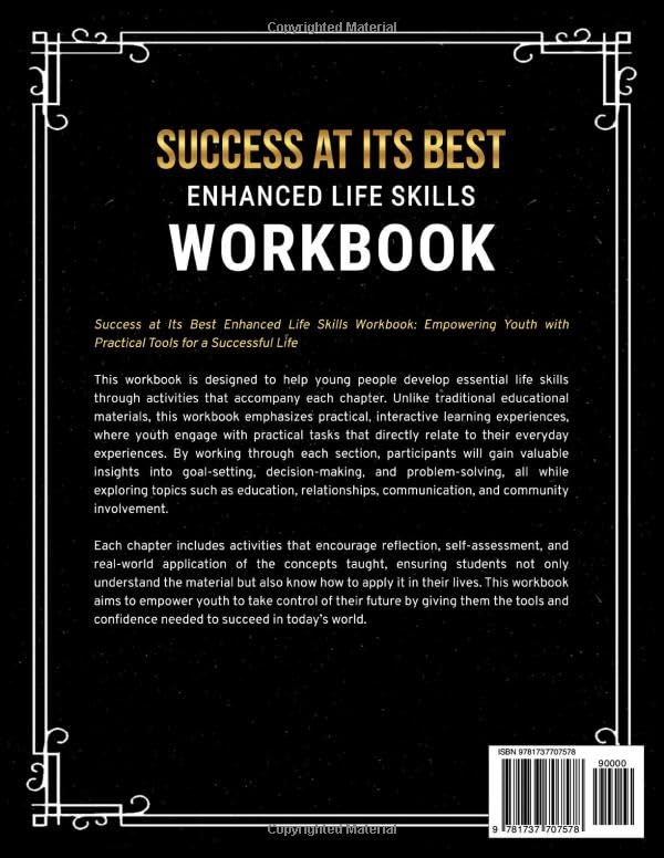 Success at Its Best Enhanced Life Skills Workbook: Empowering Youth with Practical Tools for a Successful Life This workbook is designed to help young people develop essential life skills through activities that accompany each chapter. Unlike traditional educational materials, this workbook emphasizes practical, interactive learning experiences, where youth engage with practical tasks that directly relate to their everyday experiences. By working through each section, participants will gain valuable insights into goal-setting, decision-making, and problem-solving, all while exploring topics such as education, relationships, communication, and community involvement. Each chapter includes activities that encourage reflection, self-assessment, and real-world application of the concepts taught, ensuring students not only understand the material but also know how to apply it in their lives. This workbook aims to empower youth to take control of their future by giving them the tools and confidence needed to succeed in today’s world.