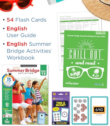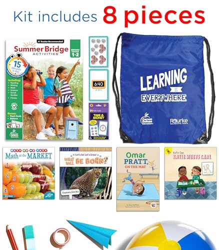 Bridging Grade 1 to Grade 2 for kids ages 6-7 Build a bridge of learning opportunities for your soon-to-be 2nd grader–from school to home and back again in just 15 minutes a day with engaging children’s books, manipulatives, and learning adventures–all in one bundle! Summer Learning 2nd Grade Workbooks, Math Flash Cards, and Kid’s Books are a great way for to reinforce 1st grade math, phonics, math, science, reading comprehension, and writing practice that is both fun AND educational! Why You’ll Love This Summer Learning Bundle Engaging and educational daily learning adventures. Students can practice their reading comprehension skills with the included children’s books, as well as math skills with the time and money flash cards. The Summer Bridge Activities 1-2 Workbook features reading comprehension, math, science, and handwriting activities, and includes flash cards, stickers, and fun fitness activities, too! On-The-Go Learning Fun. Each bundle is stored securely in the durable drawstring bag so your child can practice skills on-the-go. About Summer Bridge Activities(r) Summer Bridge Activities research-supported products build a bridge of learning opportunities from school to home and back again! Daily activities engage children in a variety of quick, 15-minute active learning adventures that just might be their favorite time of the day. The 1st Grade & 2nd Grade Summer Learning Bundle Contains: Summer Bridge Activities 1-2 Workbook Time and Money math flash cards 4 Children’s Books User Guide