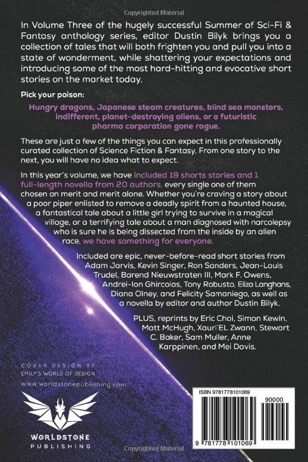 Pick your poison: Hungry dragons, Japanese steam creatures, blind sea monsters, indifferent, planet-destroying aliens, or a futuristic pharma corporation gone rogue. These are just a few things you can expect in this professionally curated collection of Science Fiction & Fantasy. From one story to the next, you will have no idea what to expect. In Volume Three of the hugely successful Summer of Sci-Fi & Fantasy anthology series, editor Dustin Bilyk brings you a collection of tales that will both frighten you and pull you into a state of wonderment, while shattering your expectations and introducing some of the most hard-hitting and evocative short stories on the market today. In this year’s volume, we have included 19 shorts stories and 1 full-length novella from 20 authors. Whether you’re craving a story about: a poor piper enlisted to remove a deadly spirit from a haunted house a little girl trying to survive in a magical village in spite of her swindling, con-artist grandmother a man diagnosed with narcolepsy who is sure he is being dissected from the inside by an alien race a barbarian with a dark secret fighting for his life in a ring against a slew of mythical beasts, as the nobility looks on a young girl disappearing one day in front of her house, the only evidence being her footsteps in the dew ending halfway across the lawn a wooden girl’s journey across medieval Japan in the hands of her captors, her only friends a wayward bunny and a drunken samurai …we have something for everyone. Included are epic, never-before-read short stories from Adam Jarvis, Kevin Singer, Ron Sanders, Jean-Louis Trudel, Barend Nieuwstraten III, Mark F. Owens, Andrei-Ion Ghircoias, Tony Robusto, Eliza Langhans, Diana Olney, and Felicity Samaniego, as well as a novella by editor and author Dustin Bilyk. PLUS, reprints by Eric Choi, Simon Kewin, Matt McHugh, Xauri’EL Zwann, Stewart C. Baker, Sam Muller, Anne Karppinen, and Mei Davis.