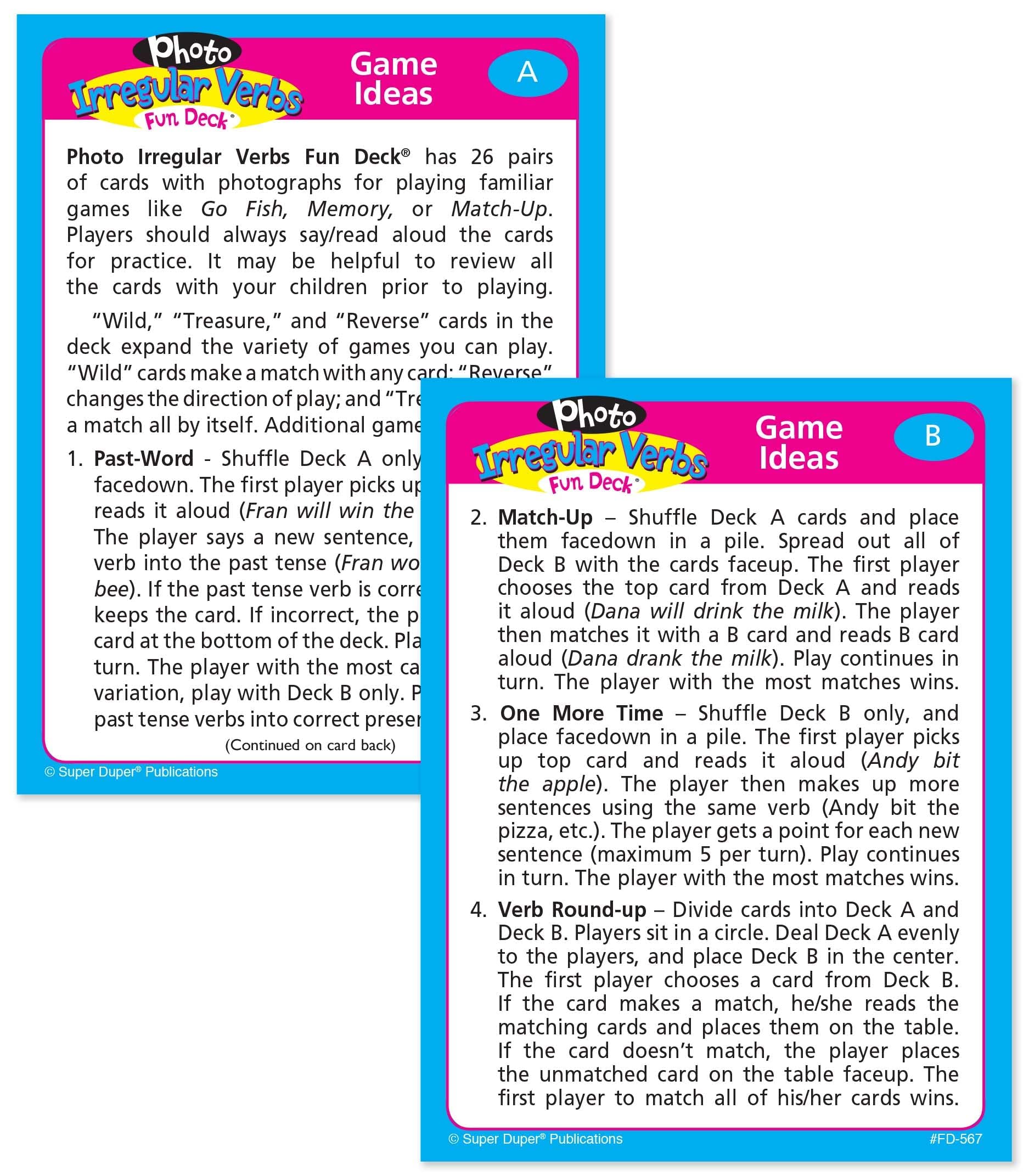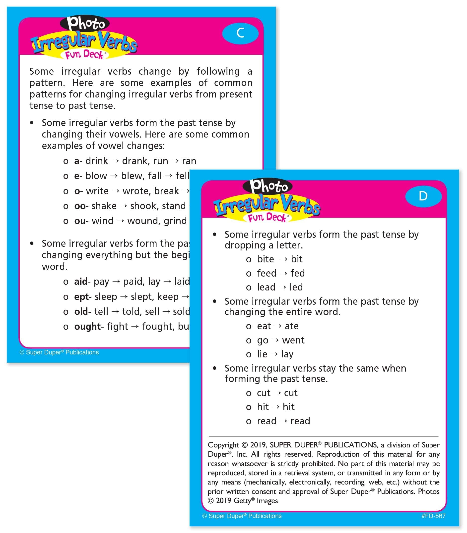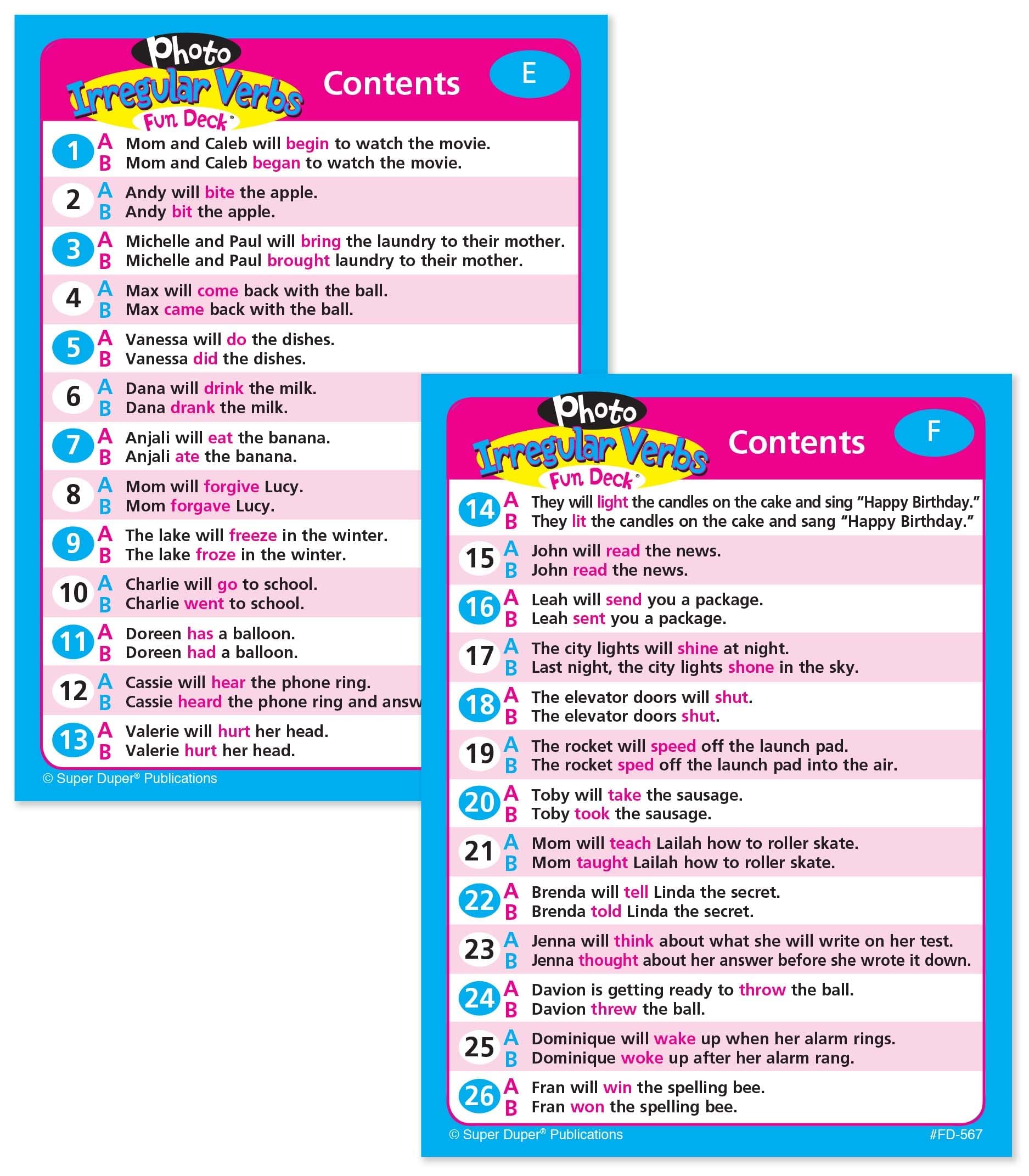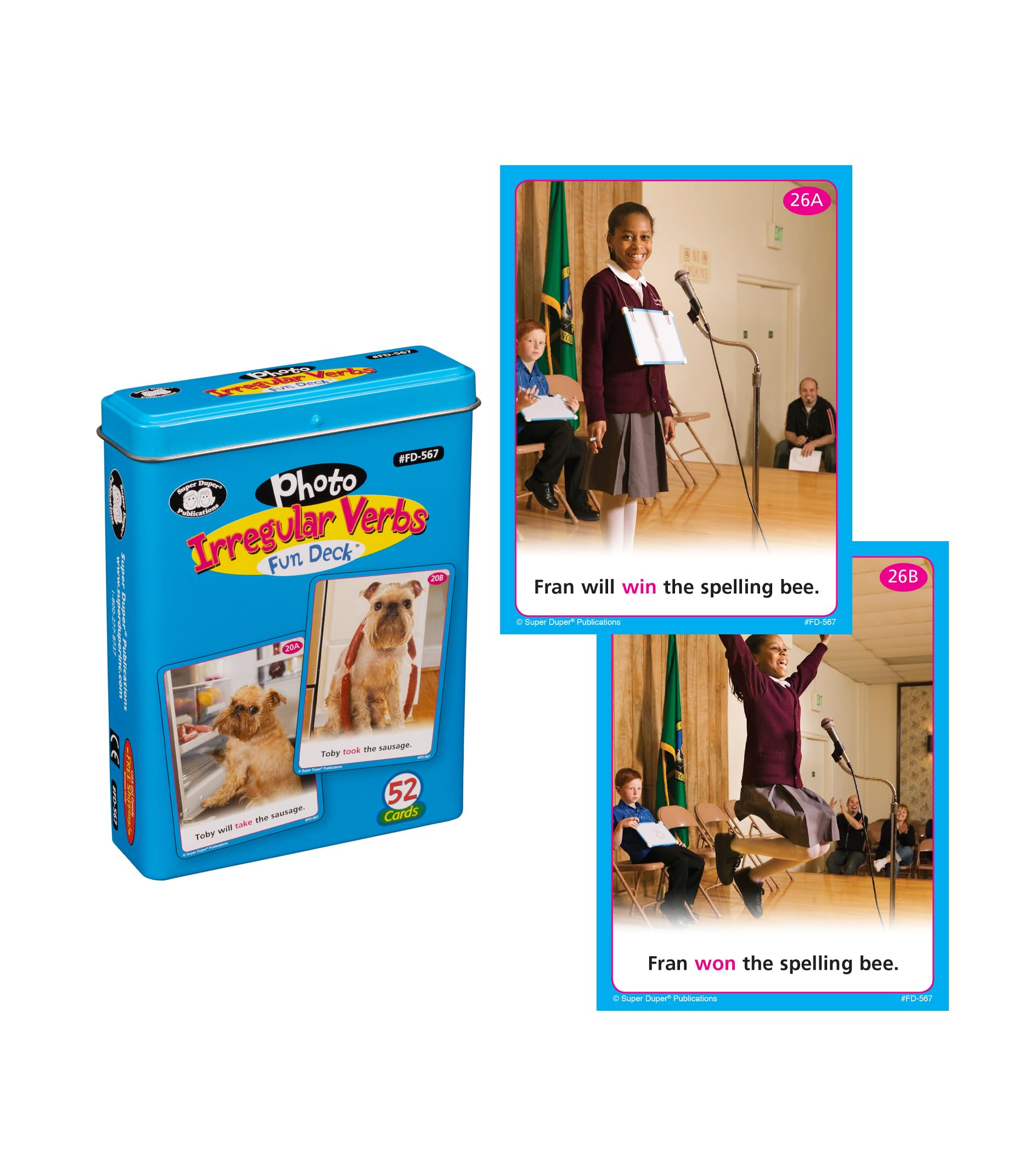 To make a regular verb past tense, you simply add -ed. Many verbs, however, are irregular in the past tense (drink/drank, take/took, etc.). Photo Irregular Verbs Fun Deck contains 26 (3″ x 4″) pairs of brilliant picture cards that will motivate students to learn these unique verbs. Each pair contains the present/future tense and irregular past tense forms. Deck includes 52 photo cards, “Bonus” cards, contents, and game ideas in a sturdy tin.