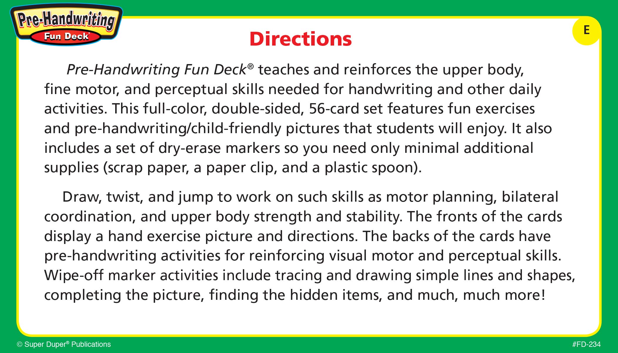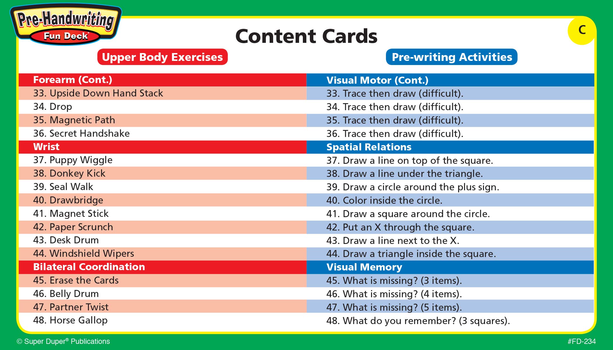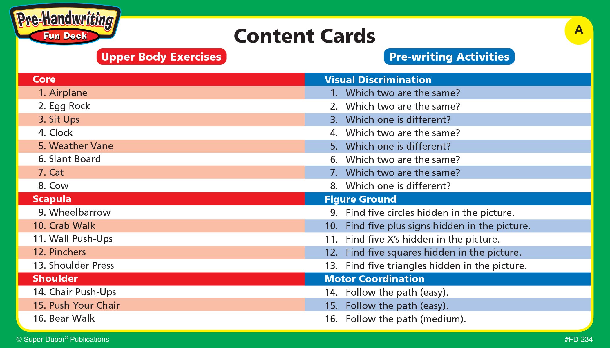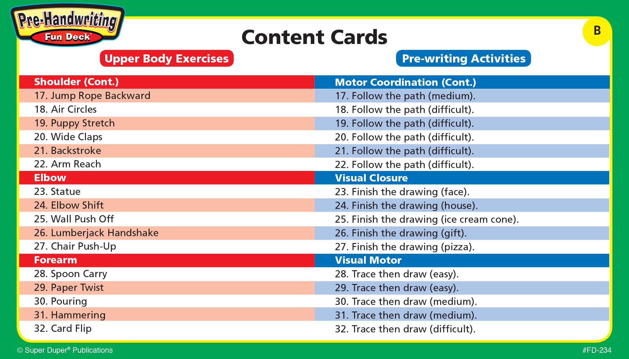 - 56 double-sided illustrated cards (4″ x 7″) – The front has exercise illustrations and the back has drawing activities