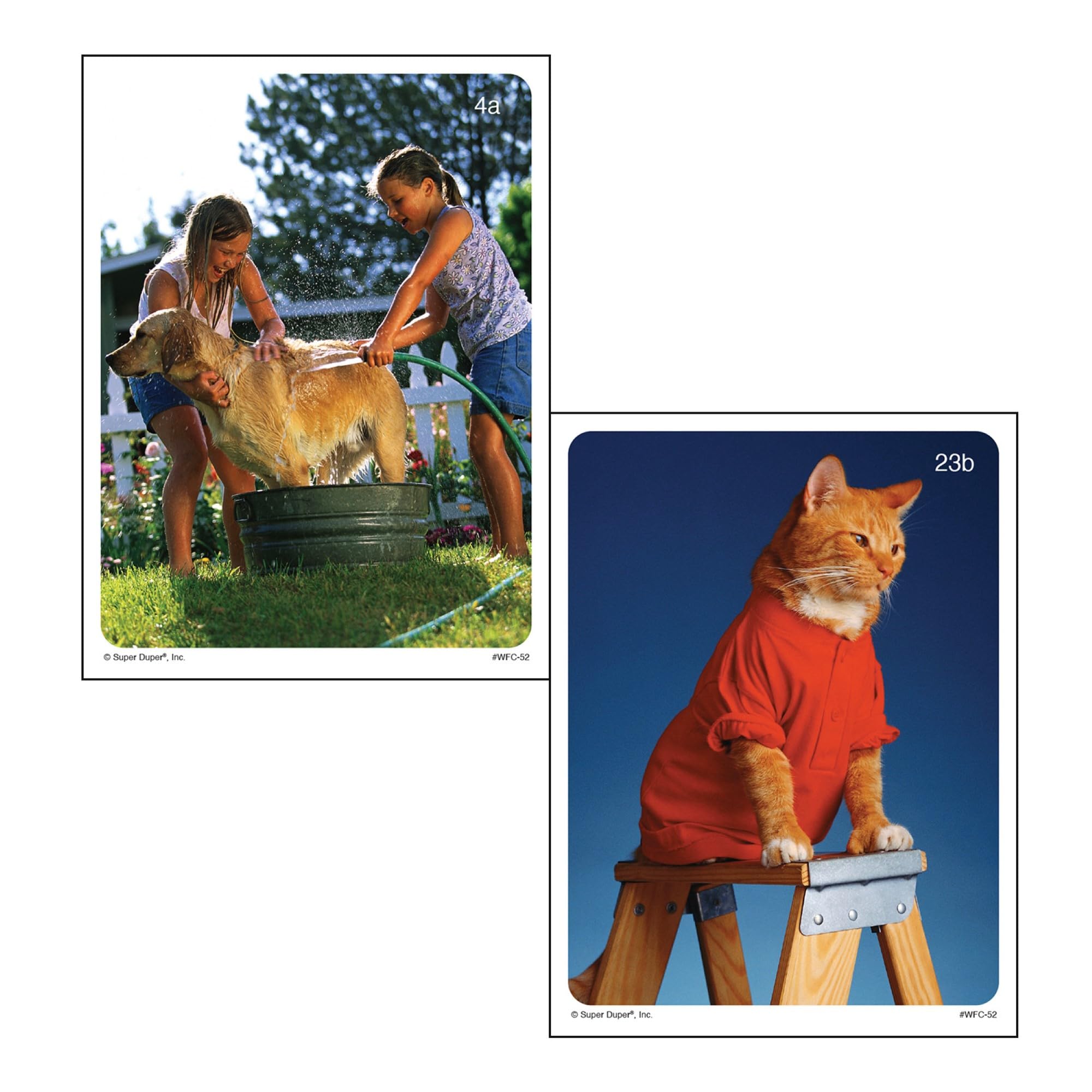 Webber Photo Cards Describing Fun with Dogs & Cats deck contains 30 pairs of our cutest dog and cat photos. The 60 card set (15 pairs of dogs and 15 pairs of cats) is perfect for encouraging conversational speech, improving descriptive language, and writing activities. They are ideal for match-up and Go Fish games, too. Also includes two bonus cards (milk for the cat and a dog bone) and multicultural content/game idea cards in six languages (English, Spanish, French, German, Japanese, and Chinese).