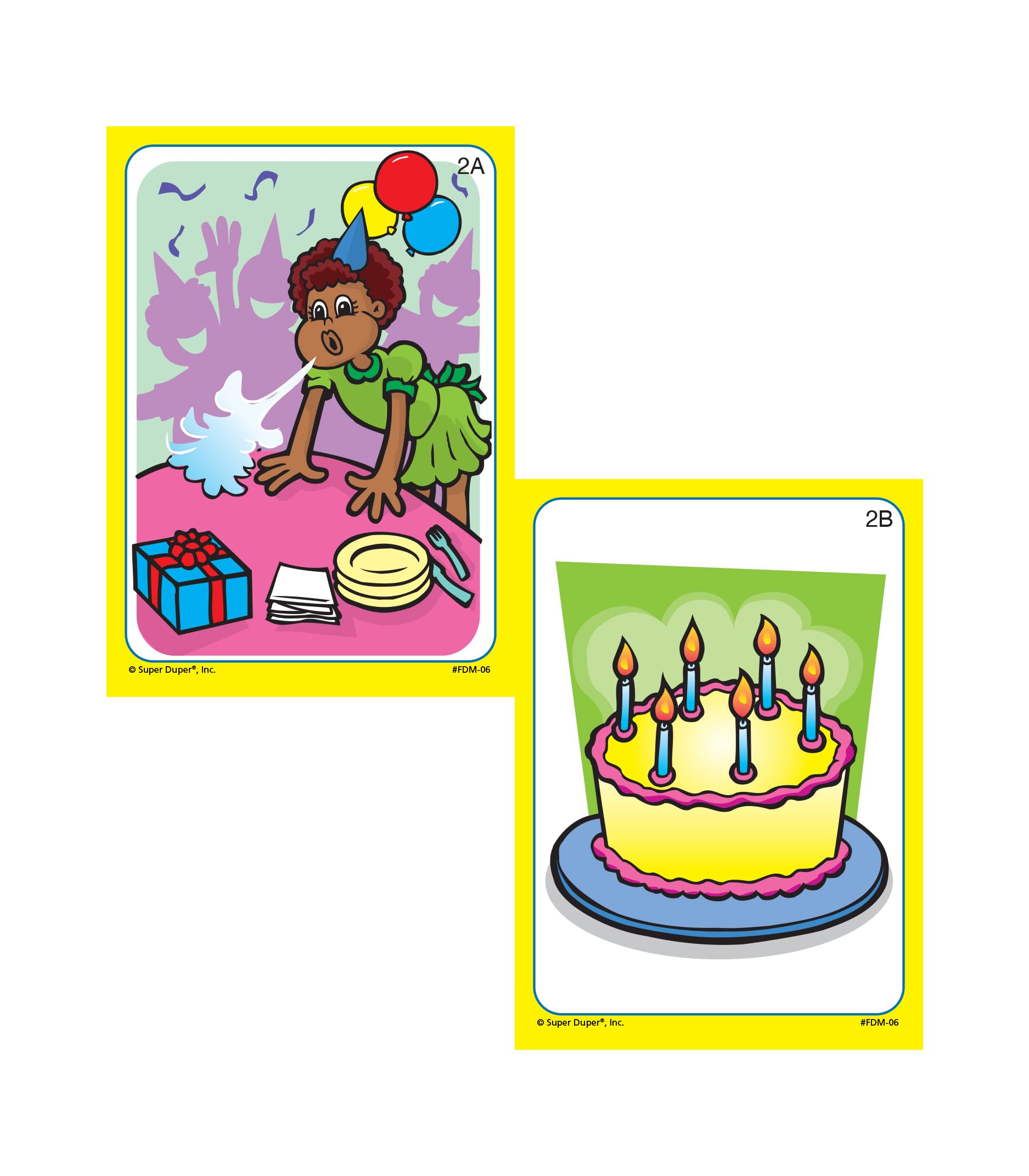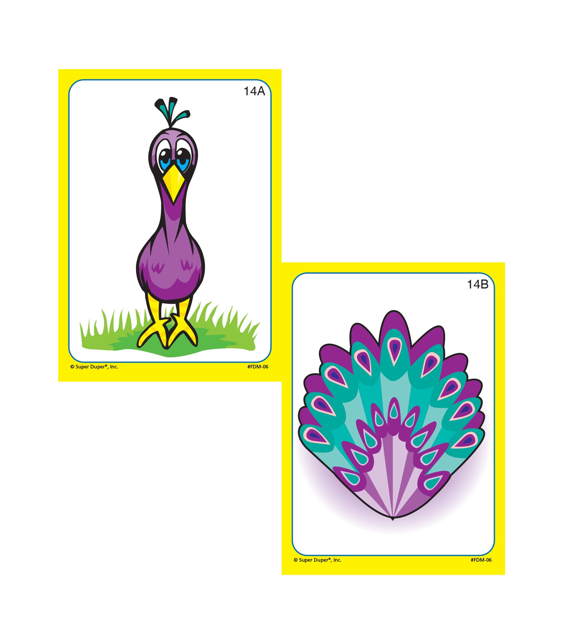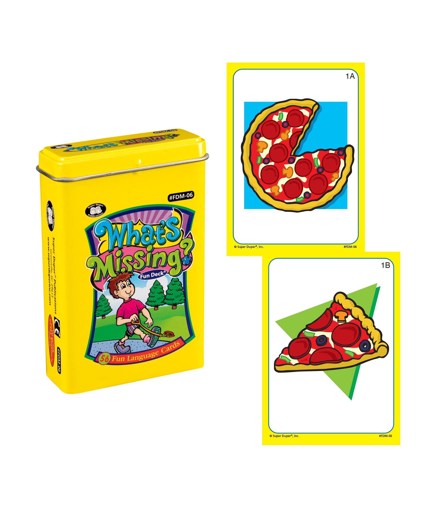 - 54 colorfully illustrated Cards (2 1/2″ x 3 1/2″) – 26 card pairs each match an illustration (e.g., a boy diving.) with the missing item (swimming pool)