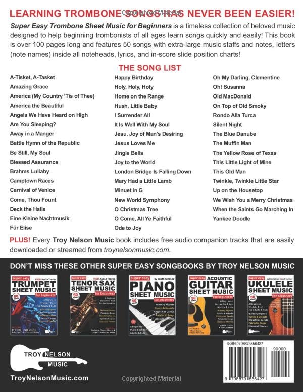 Learn 50 super-easy big-note sheet music songs for trombone! This big book of easy trombone sheet music includes extra-large music staffs and notes, letters (note names) inside all noteheads, lyrics, and in-score slide position charts! No complicated trombone sheet music arrangements here! Instead, Super Easy Trombone Sheet Music for Beginners is arranged with beginning trombonists of all ages in mind. This easy trombone sheet music songbook is the best way to learn your favorite songs on the instrument. It’s never too late to learn how to play the trombone! This simple trombone songbook is over 100 pages long and is the best way to learn your favorite songs on the trombone. This large print trombone songbook with letters includes Nursery Rhymes, Classical sheet music, Christian sheet music with Hymns and Gospels, Christmas sheet music, and Patriotic and Folk sheet music. With each song, you’ll get: A beginner-level big-note song arrangement Downloadable and streamable audio tracks Extra-large music staffs and notes Letters (note names) inside all noteheads In-score slide position charts Lyrics This is the ultimate trombone sheet music songbook for learning your favorite songs–fast! The 50 Songs: A-Tisket, A-Tasket Amazing Grace America (My Country ‘Tis of Thee) America the Beautiful Angels We Have Heard on High/li> Are You Sleeping? Away in a Manger Battle Hymn of the Republic Be Still, My Soul Blessed Assurance Brahms Lullaby Camptown Races Carnival of Venice Come, Thou Fount Deck the Halls Eine Kleine Nachtmusik Fur Elise Happy Birthday Holy, Holy, Holy Home on the Range Hush, Little Baby I Surrender All It Is Well With My Soul Jesu, Joy of Man’s Desiring Jesus Loves Me Jingle Bells Joy to the World London Bridge Is Falling Down Mary Had a Little Lamb Minuet in G New World Symphony O Christmas Tree O Come, All Ye Faithful Ode to Joy Oh My Darling, Clementine Oh! Susanna Old MacDonald On Top of Old Smoky Rondo Alla Turca Silent Night The Blue Danube The Muffin Man The Yellow Rose of Texas This Little Light of Mine This Old Man Twinkle, Twinkle Little Star Up on the Housetop We Wish You a Merry Christmas When the Saints Go Marching In Yankee Doodle Super Easy Trombone Sheet Music for Beginners includes some of the most beloved songs ever written! FREE: Access to instant audio downloads from Troy Nelson Music’s website is included. BONUS: Includes customer support! Questions during practice? Just email us, and we’ll happily help you. Since 2016, Troy Nelson Music has offered customers the most comprehensive and easy-to-follow lesson books and songbooks for a variety of instruments–everything from guitar and mandolin to piano, saxophone, and clarinet. With 30+ years in the music publishing industry, veteran guitarist Troy Nelson has sold hundreds of thousands of books as both an author and publisher due to the quality and effectiveness of his books and the service his company provides.
