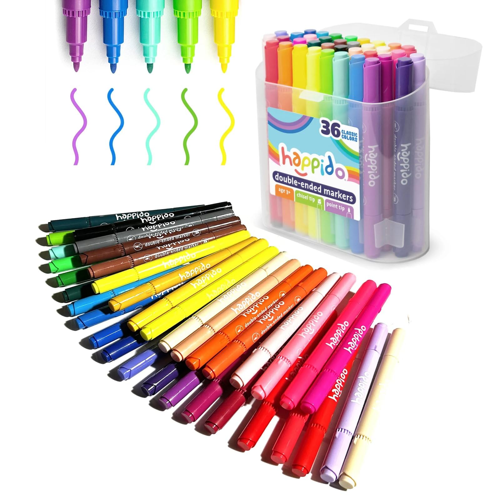 - [REUSABLE CARRY CASE FOR EASY TRAVEL AND STORAGE]: Housed in a unique oval shaped reusable carrying case the kids 36 double-ended markers for safekeeping. A sturdy case with a handy handle makes this double sided marker case ready for travel or perfect for everyday storage
