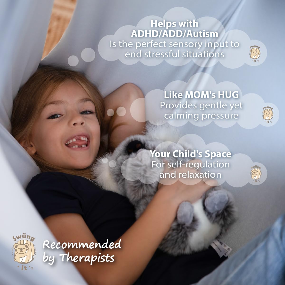 - GAMIFY SENSORY INTEGRATION – We want your child to feel comfortable using the cozy cloth. The cuddle swing perfectly adapts to your child’s needs. A FUN way to improve balance and coordination.