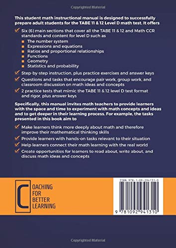 TABE 11 & 12 Math Student Book Level D This student manual is designed to successfully prepare adult students for the TABE 11 & 12 Level D math test and vocational training admission tests. In other words, this manual presents exercises that help adult education programs, Workforce programs, and their adult students meet the Workforce Innovation and Opportunity Act (WIOA) math expectations. It offers six (6) sections that cover all the TABE 11 & 12 and Math CCR standards and content for level D such as: 1) the number system, 2) expressions and equations, 3) ratios and proportional relationships, 4) functions, 5) geometry, and 6) statistics and probability. The book also offers step-by-step instruction, plus practice exercises and answer keys, questions and tasks that encourage pair work and group work, and classroom discussion on math ideas and concepts. It presents 2 practice tests that mimic the TABE 11 & 12 level D test format and rigor, plus answer keys. Specifically, this manual invites math teachers to provide learners with the space and time to experiment with math concepts and ideas and to get deeper in their learning process. For example, the tasks presented in this book aim to make learners think more deeply about math and therefore improve their mathematical thinking skills, provide learners with hands-on tasks relevant to their situation, help learners connect their math learning with the real world, create opportunities for learners to read about, write about, and discuss math ideas and concepts.