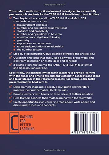 TABE 11 & 12 Math Student Textbook Level M This math instructional manual is designed to successfully prepare adult students for the TABE 11 & 12 Level M math test and vocational training admission tests. In other words, this manual presents exercises that help adult education programs, Workforce programs, and their adult students meet the Workforce Innovation and Opportunity Act (WIOA) math expectations. It offers Ten chapters that cover all the TABE 11 & 12 and Math CCR standards content such as: 1) measurement and data, 2) number and operations (plus fractions), 3) statistics and probability, 4) number and operations in base ten, 5) operations and algebraic thinking, 6) geometry, 7) expressions and equations, 8) ratios and proportional relationships, and 9) the number system. The book also offers step-by-step instruction, plus practice exercises and answer keys, questions and tasks that encourage pair work and group work, and classroom discussion on math ideas and concepts. It presents 2 practice tests that mimic the TABE 11 & 12 level M test format and rigor, plus answer keys. Specifically, this manual invites math teachers to provide learners with the space and time to experiment with math concepts and ideas and to get deeper in their learning process. For example, the tasks presented in this book aim to make learners think more deeply about math and therefore improve their mathematical thinking skills, provide learners with hands-on tasks relevant to their situation, help learners connect their math learning with the real world, create opportunities for learners to read about, write about, and discuss math ideas and concepts.