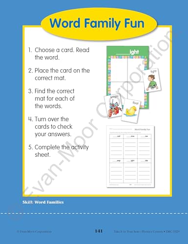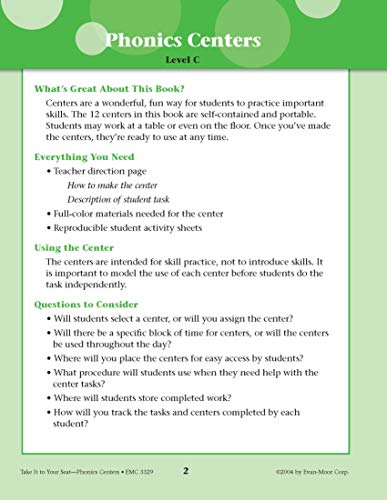 Take It to Your Seat Phonics Centers, Level C is an instructional must-have for grades 1-2 classrooms. The 12 full-color centers stored in envelopes provide engaging, independent practice of the phonics skills presented. Includes topics like long and short vowels, consonant and vowel digraphs word families, and inflectional endings. This resource contains teacher support pages, reproducible student pages, and an answer key. 192 pages.