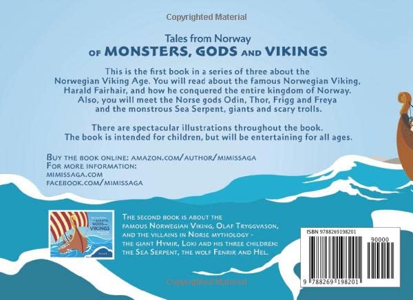 The book is a wonderful addition to any library – Victoria Hofmo, The Norwegian American. Welcome to the fascinating world of the Vikings and Norse gods. Meet the Norwegian Viking Harald Fairhair battling for 10 years to become the sole king of Norway and to win Princess Gyda. Enjoy tales of Odin, Thor, Frigg, Freya, trolls, monsters and other supernatural creatures in the Norse mythology. It’s a mixture of myths and historical facts based on sagas and Norwegian history. The storytelling is in English. There are spectacular illustrations of the main characters and events throughout the book. The book is intended for kids, but will also be entertaining and educational for teens and adults. This book is a new edition of the first book in Mimi’s Saga, previously published as “Tales from Norway of Vikings, gods, giants and trolls”.
