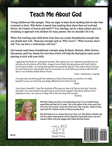 Would you like to study the Bible with your preschooler but don’t know how to get started? You don’t have to be a trained educator to teach your child about God. For thousands of years, parents have taught their children about God by telling them Bible stories and discussing them as a family. These lessons will help you to do the same thing with your child. When first teaching your child about God, there are certain foundational concepts with which you should start. These are concepts such as “Who God is,” “What God has done,” “You can have a relationship with God,” “You can be all God wants you to be,” and “You can do all God wants you to do.” Our lessons teach foundational concepts such as “Who God Is” and “What God Has Done” using Fun, Hands-On Activities; Bible Stories; Discussion; and Scripture Memory which will help the theological seeds you’re planting to stick with your child. Unique features of Teach Me About God: 112 daily lesson plans Detailed lesson plans for each activity, including materials lists, step-by-step instructions for preparation, and the steps necessary for teaching each lesson Developed by a Sunday School and Awana preschool teacher with over 10 years of experience Most materials are easily found around the home or are simple to purchase making teacher preparation quick and painless Includes an appendix with original illustrations Can use concurrently with Learn and Grow: Hands-on Lessons for Active Preschoolers This book is also available in an ebook version! You can purchase a COMPLETE ebook version of this curriculum on Amazon using the below links: 1 – Lessons 1-56: https://amzn.to/3IyDHNj 2 – Lessons 57-112: https://amzn.to/3SA6plm