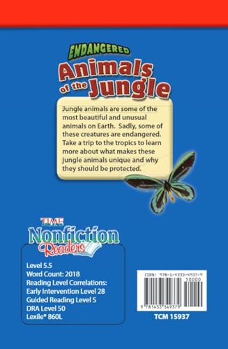 Take a trip to the tropics to learn about what makes jungle animals so unique and why they need to be protected. This nonfiction title allows readers to discover the causes of endangered animals–including poaching and habitat loss–through astonishing facts and colorful images of these beautiful animals in conjunction with informational text and helpful charts and diagrams. With a glossary of terms, an index, and a list of resources and websites, children will be inspired to take part in the conservation of jungle animals. About Shell Education Rachelle Cracchiolo started the company with a friend and fellow teacher. Both were eager to share their ideas and passion for education with other classroom leaders. What began as a hobby, selling lesson plans to local stores, became a part-time job after a full day of teaching, and eventually blossomed into Teacher Created Materials. The story continued in 2004 with the launch of Shell Education and the introduction of professional resources and classroom application books designed to support Teacher Created Materials curriculum resources. Today, Teacher Created Materials and Shell Education are two of the most recognized names in educational publishing around the world.
