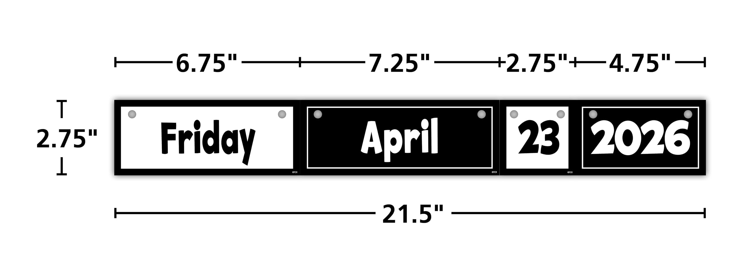 - Complete flip calendar measures approx. 21-1/2″ x 2-3/4″ when assembled onto a magnetic curtain rod. Binder rings and magnetic curtain rod not included.