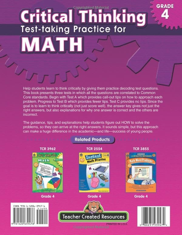 Teacher Created Resources “Critical Thinking: Test-taking” Practice Book for Math is ideal for grade 4 and contains 112 pages. It helps in critical analysis of text and to answer the test questions that are correlated to Common Core Standards. It contains test A that offers call-out tips on how to approach each question or problem, test B that provides fewer tips and test C that provides no tips. It also contains the answer key with explanations for why one answer is correct and the others are incorrect.