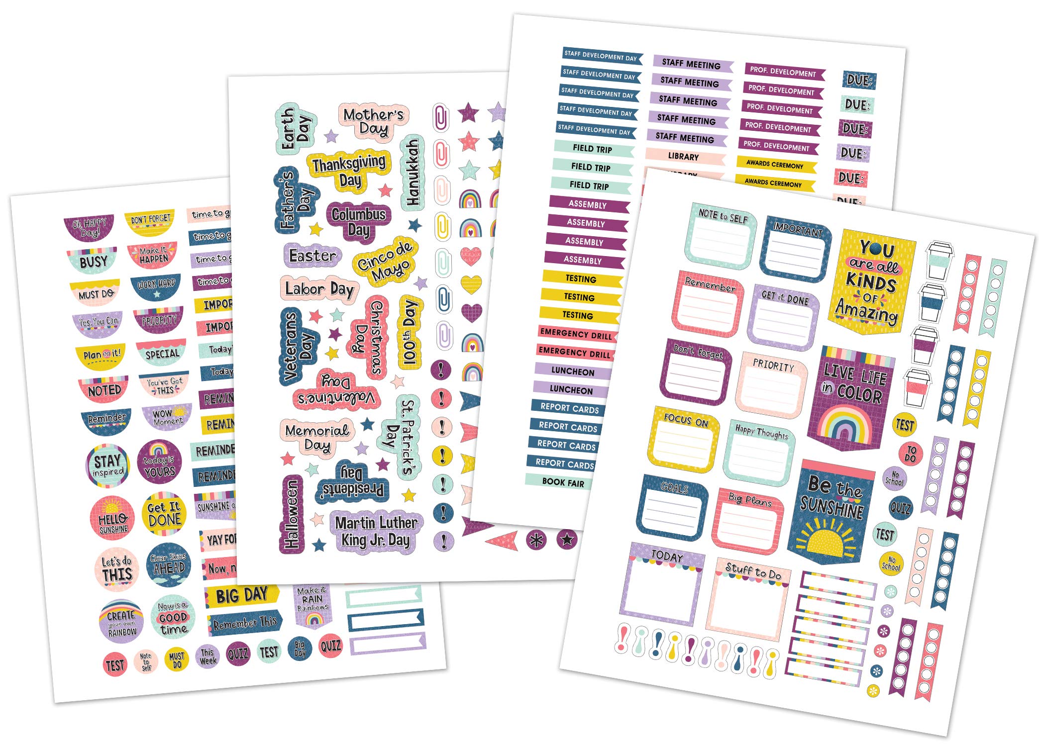 This lesson planner will add joy and color to your day! This charming lesson planner will add style to your school day! Keep up to 40 weeks of daily lesson plans in one convenient book! This book includes substitute teacher information, student roster sheets, and memorable quotations to use and discuss throughout the year. 12 large monthly planning calendar spreads are also included for year-long lesson planning as well as for scheduling appointments, conferences, and events. The lesson planner also includes a variety of colorful stickers to use throughout the year. Whether you need to prioritize the day’s events, add weekly reminders, highlight something special, or simply provide a bit of inspiration these cheerful stickers will keep your lessons beautifully organized.