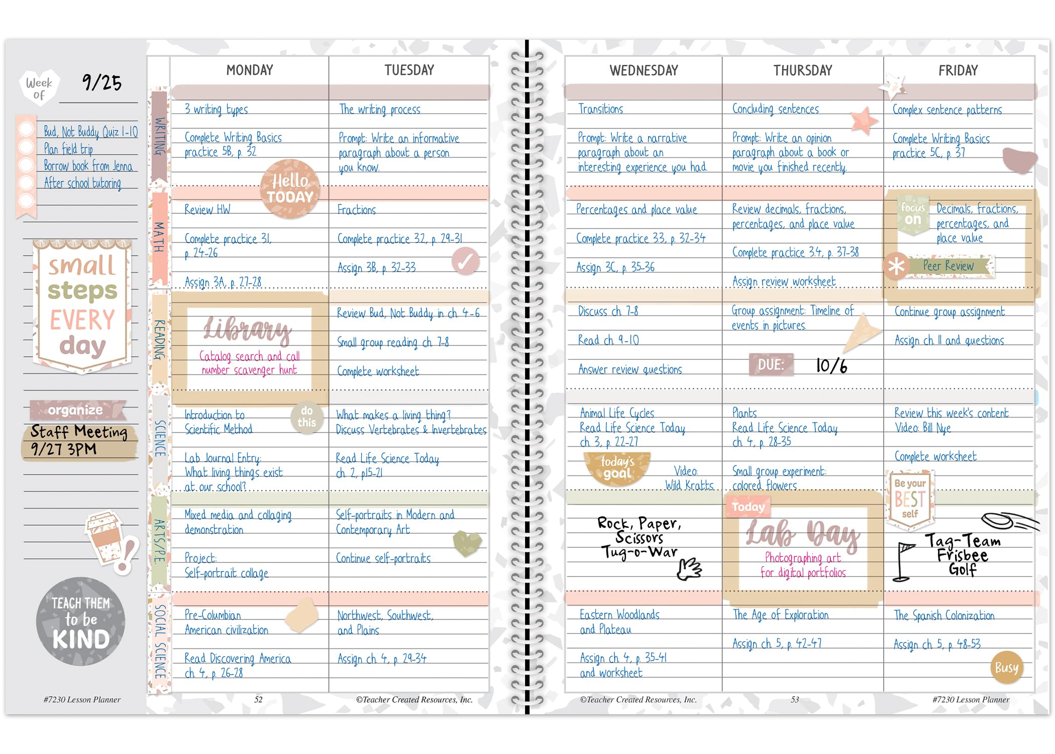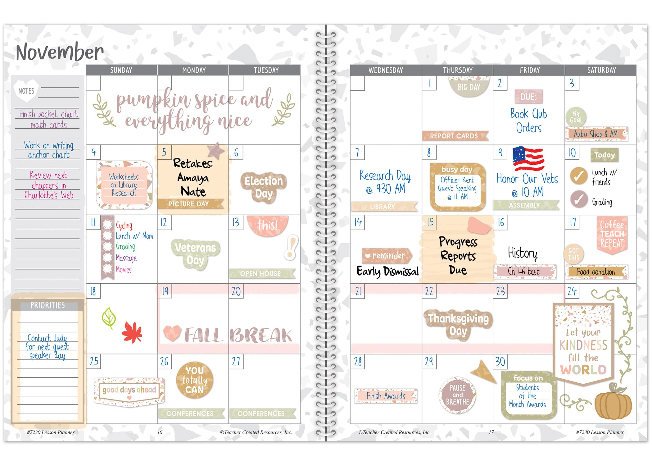 - Twelve large monthly planning calendar spreads are also included for year-long lesson planning as well as for scheduling appointments, conferences, and events.