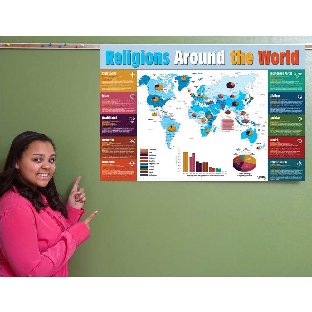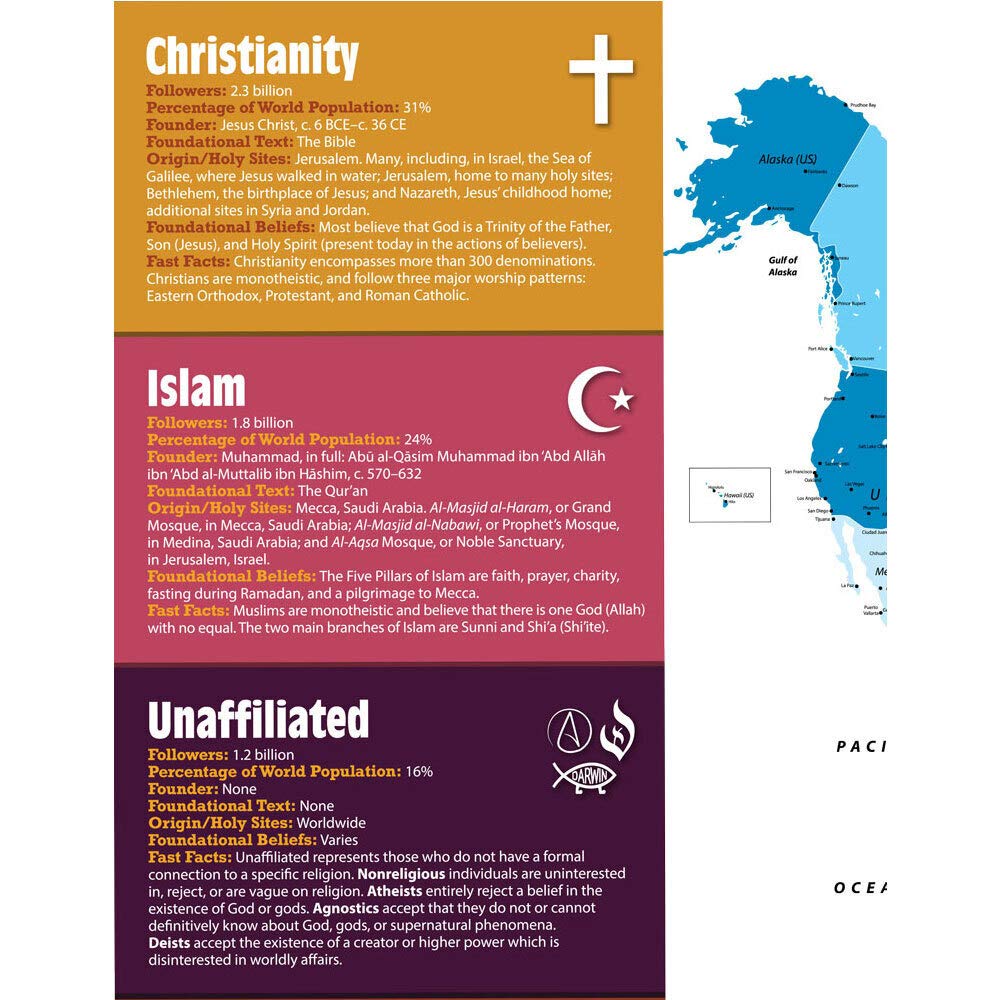 Across the globe, people of faith practice their beliefs every day. But what are those beliefs? And where do they live and worship? The 10 most-practiced religions–including unaffiliated individuals and indigenous religions–are described in accessible language arranged by: Religion Followers Founder Foundational Text Origin/Holy Sites Foundational Beliefs Fast Facts A comprehensive world map features charts showing the distribution of belief by regions, which allows students to easily and graphically see where religions are practiced. Useful information, color coding, and different ways to access data make this a powerful resource for discussions of religion, geography, history, and the current geopolitical climate. (c)2018. High school. 36 x 24 inches. Laminated.