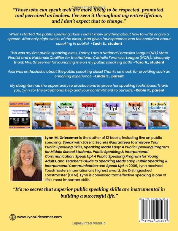 Teacher’s Guide to Speaking Made Easy, Public Speaking & Interpersonal Communication, and Speak Up! The Teacher’s Guide is designed to help instructors present successful programs. Tips, hints, formats, and lesson plans are provided for (1) Speaking Made Easy: A Public Speaking Program for Middle School Students, (2) Public Speaking & Interpersonal Communication, and (3) Speak Up! A Public Speaking Program for Young Adults (Beginners). The Teacher’s Guide is highly recommended for instructors.