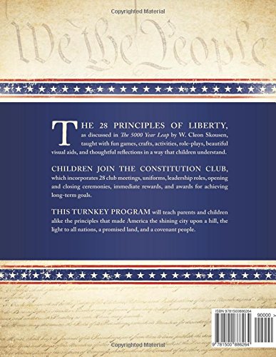Both a manual and a program, “Teaching Children the 28 Principles of Liberty” expounds upon the principles in Cleon Skousen’s book, “The 5000 Year Leap,” and lays out a program to help adults teach the principles to children. This is not just a rewrite Skousen’s book, but a manual for adults to teach children ages 8-11 these principles. The principles are not difficult to understand, but Skousen wrote his book for adults, not children. Each lesson teaches one principle per each hour-long meeting, with fun games, activities, role-plays, crafts, songs, and thoughtful, reflective discussions. The book is also a program. To present these lessons and entice children to want to learn them, the children join a club, called the Constitution Club. Each club member has a leadership position in the club. Every club has to have a president. This club also has a secretary of defense, a secretary of the treasury, a secretary of the interior, a chief of staff, and so forth. The club members all have specific responsibilities in their club. Club meetings start with an opening ceremony, including a prayer and pictures and quotes from our Founding Fathers supporting the principle learned about in that club meeting. They get to wear club uniforms. They receive immediate rewards for good behavior, such as participating in the activities, showing up on time, fulfilling their duties in their leadership positions. At the end of the 28 club meetings, if they fulfill all of the requirements they receive a beautiful plaque with their name engraved on it, the coveted James Madison Award. The layout is much like a cookbook: each club meeting lesson spells out what supplies the adult leader will need and step-by-step instructions for every activity. We are living the results of generations of people NOT knowing these principles. We elect leaders from the president on down to city councilmen who don’t know these principles. We are how many trillions of dollars in debt? Our economy is stagnant. Our country is declining morally. Property rights are ignored. Religious liberty is allowed only if it doesn’t interfere with the government’s interests. One may like to elect leaders who will govern and lead following principles of liberty. But campaign trickery will only go so far. What needs to happen is for adults, especially parents, to teach their children these principles. When that happens the people will not have to be tricked into voting for the virtuous candidate, but they will seek him or her out and know what to look for. This will not happen in one election cycle. It has taken 100 years for Progressive Socialism to infiltrate our country; it may take a generation or longer to turn things around, one child’s heart and mind at a time.