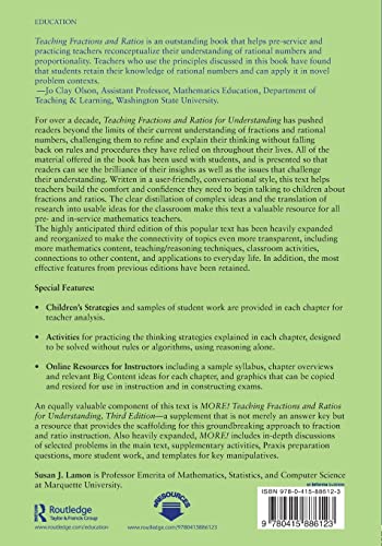 Written in a user-friendly, conversational style, the fourth edition of this groundbreaking text helps pre-service and in-service mathematics teachers build the comfort and confidence they need to begin talking to children about fractions and ratios, distilling complex ideas and translating research into usable ideas for the classroom. For two decades, Teaching Fractions and Ratios for Understanding has pushed readers beyond the limits of their current understanding of fractions and rational numbers, challenging them to refine and explain their thinking without falling back on rules and procedures they have relied on throughout their lives. All of the material offered in the book has been used with students, and is presented so that readers can see the brilliance of their insights as well as the issues that challenge their understanding. Each chapter includes children’s strategies and samples of student work for teacher analysis, as well as activities for practicing each thinking strategy, designed to be solved without rules or algorithms, using reasoning alone. The fourth edition of this popular text has been updated throughout and includes new examples of student work, updated artwork, and more. As with previous editions, an equally valuable component of this text is the companion book MORE! Teaching Fractions and Ratios for Understanding (2012), a supplement that is not merely an answer key but a resource that provides the scaffolding for the groundbreaking approach to fraction and ratio instruction explored here. MORE! includes in-depth discussions of selected problems in the main text, supplementary activities, Praxis preparation questions, more student work, and templates for key manipulatives.