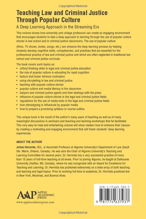 This volume shows how university and college professors can create an engaging environment that encourages students to take a deep approach to learning through the use of popular culture stories in law school and in criminal justice classrooms. The use of popular culture (films, TV shows, books, songs, etc.) can enhance the deep learning process by helping students develop cognitive skills, competencies, and practices that are essential for the professional practice of law and criminal justice and which are often neglected in traditional law school and criminal justice curricula. The book covers such topics as: critical thinking skills in legal and criminal justice education the role of popular culture in educating for rapid cognition factors that foster intrinsic motivation using storytelling in law and criminal justice teaching with popular culture stories popular culture and media literacy in the classroom lawyers and criminal justice agents and their dealings with the press influence of popular culture stories in the legal and criminal justice fields regulations for the use of media texts in the legal and criminal justice fields how stereotyping is influenced by popular media how to prepare a promising syllabus or course outline This unique book is the result of the author’s many years of teaching as well as of many meaningful discussions in seminars and teaching and learning workshops that he facilitated. This very easy-to-read and entertaining volume will show readers how to enhance their classes by creating a motivating and engaging environment that will foster students’ deep learning experiences.