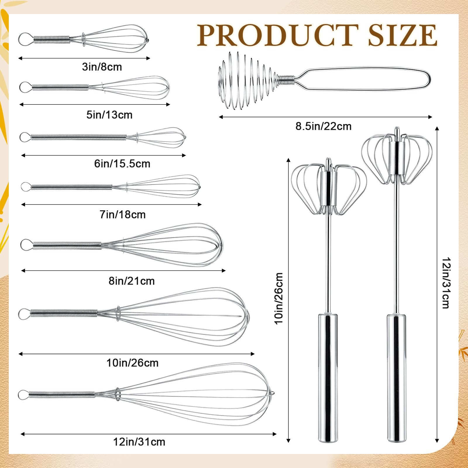 Teenyyou 10 Pcs Stainless Steel Whisks Set Egg Beater Semi Auto Whisk Blender Hand Push Beater Versatile Utensil for Kitchen Mixing Blending Beating Stirring Cooking 3 5 6 7 8 10 12 Inch