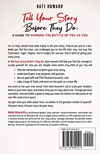 For so long, people have been trying to tell your story. They’ve put you in a box. Made you feel less than, and challenged you to live life their way. You may feel frustration, anger, disgust. You’re hungry for success. You’re tired of giving your story away. In May 2013, Nate Howard made the front page of the LA Times for sparking a movement against racial profiling after 79 LAPD officers shut down his event at USC. Realizing someone was attempting to tell his story, he founded Movement BE, a non-profit organization that helps young people discover their stories. In Tell Your Story Before They Do, Nate Howard will help you find the courage to accept yourself for who you are, despite what others may think of you. You will: Find the motivation to understand your true story, Discover your true purpose and passion, Bet on yourself, finding financial and personal success, and Take a leap of faith to start on the path to a new life. You want to live your true story, so no one can use it against you? Then heed Howard’s call to trust your intuition, listen to your inner voice, and realize what you’re truly called to be. You get what you think about most, so believe in the greatest version of yourself. No matter your background, social status or age, find your story. Tell your story. Be your story.