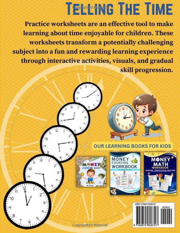 Introducing “Telling the Time: Practice Worksheets for Kids” – the comprehensive workbook with answer key, designed to transform the often daunting task of learning to tell time into a delightful and engaging experience for young learners. Unlock the world of time-telling with a collection of thoughtfully crafted worksheets covering key concepts such as reading clocks for whole hours, half hours, quarter past, quarter to, and minutes. This workbook is a valuable tool for parents and educators, providing a structured and entertaining approach to mastering the art of reading clocks. Key Features: Whole Hour: Starting with worksheets focused on reading clocks for whole hours. Half-Hour Expertise: Dive into the world of half-hours with interactive exercises that make learning about 30-minute intervals both enjoyable and effective. Watch as your child gains confidence in telling time. Quarter Past and Quarter To: Navigate through time effortlessly with worksheets dedicated to quarter past and quarter to. These exercises ensure a well-rounded understanding of time progression and enhance clock-reading skills. Varied Practice Sheets: Keep the learning experience dynamic with a variety of practice sheets with answer keys. From matching activities to drawing clock hands, each sheet is designed to reinforce concepts in an engaging & enjoyable manner. Child-Friendly Design: Captivate young minds with vibrant visuals and a child-friendly layout. The colorful design not only sparks interest but also aids in memory retention. A great gift option: A thoughtful gift option for birthdays, return gifts, Christmas gifts, and New Year gifts. Large Print for small hands: 81 pages of 8.50″ x 11″ gives plenty of space to complete each exercise. Whether you’re a parent looking to supplement your child’s time education or an educator seeking a valuable resource for the classroom to teach time, our Telling the time book is definitely the right choice. Make the journey of learning to tell time a joyous adventure for your child with “Telling the Time: Practice Worksheets for Kids.” Equip your child with essential time-telling skills and watch them flourish as they confidently navigate the world of time. Order your copy today!