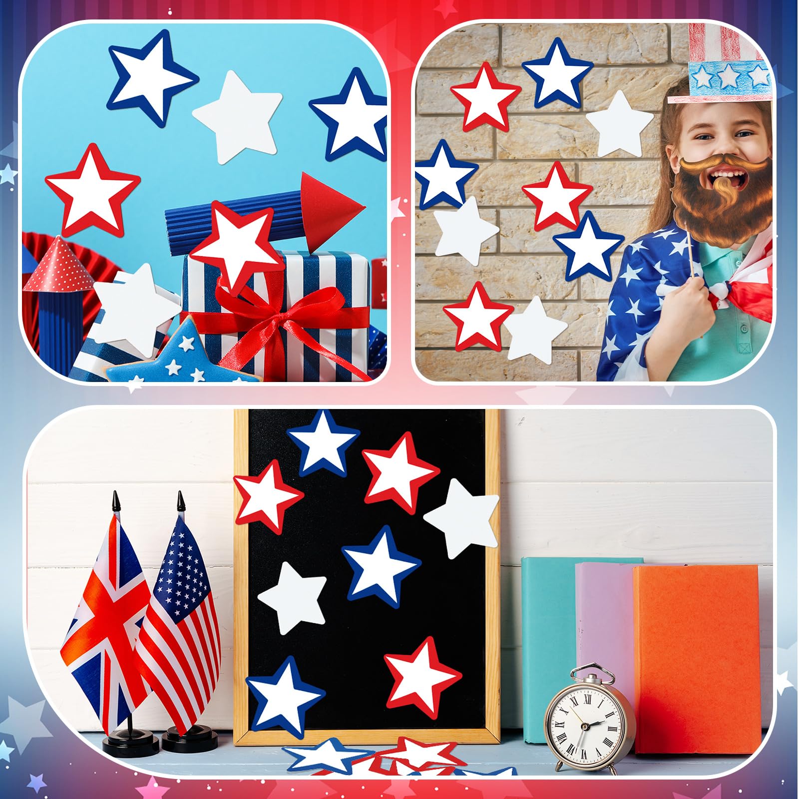 - Vibrant Dreams in Red, White, and Blue: immerse your home, office, school, or party in the patriotism with our 4th of july star cutouts; Featuring prominent shades of red, white, and blue, these symbolic pieces of decor respect the Independence Day
