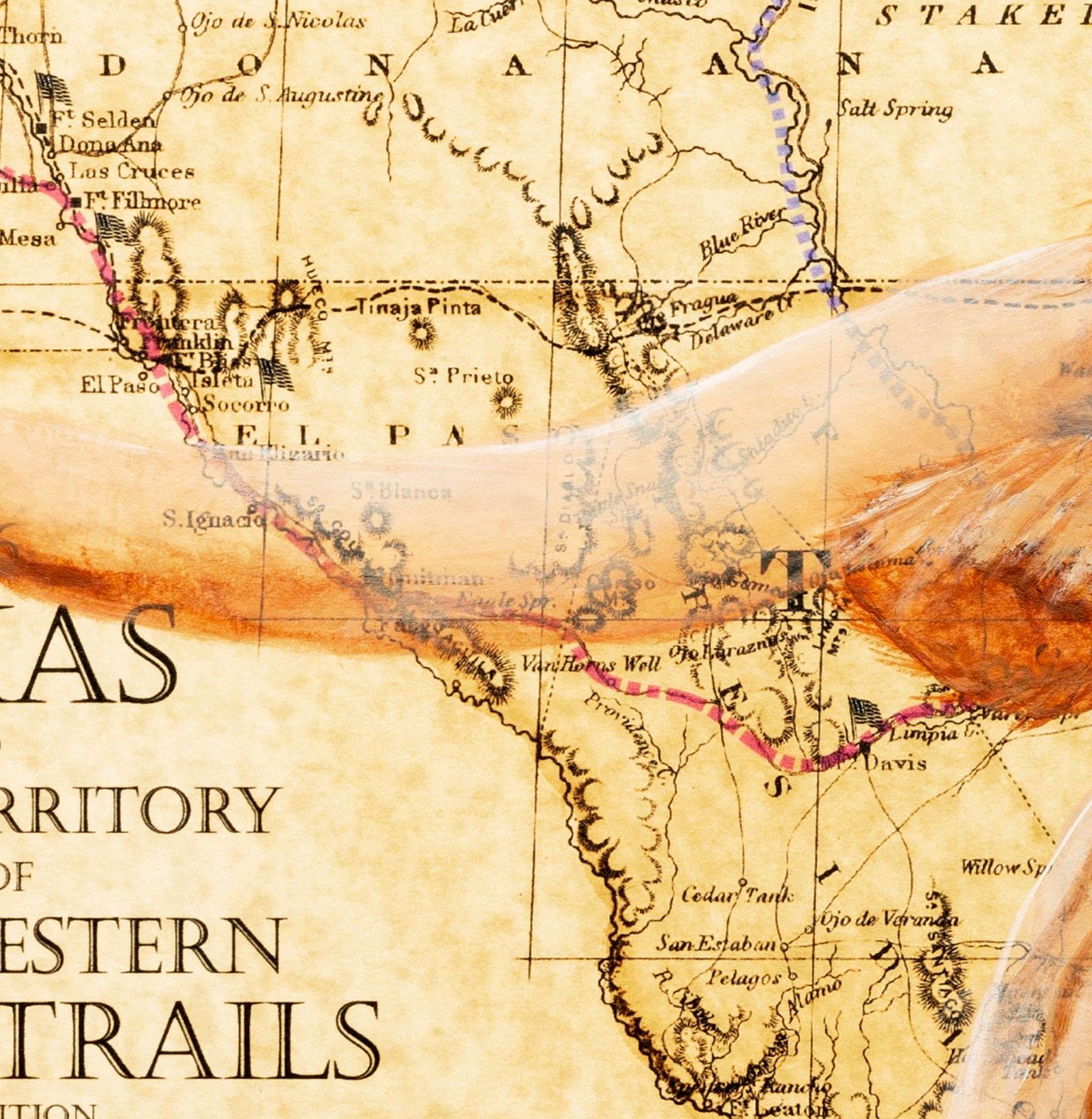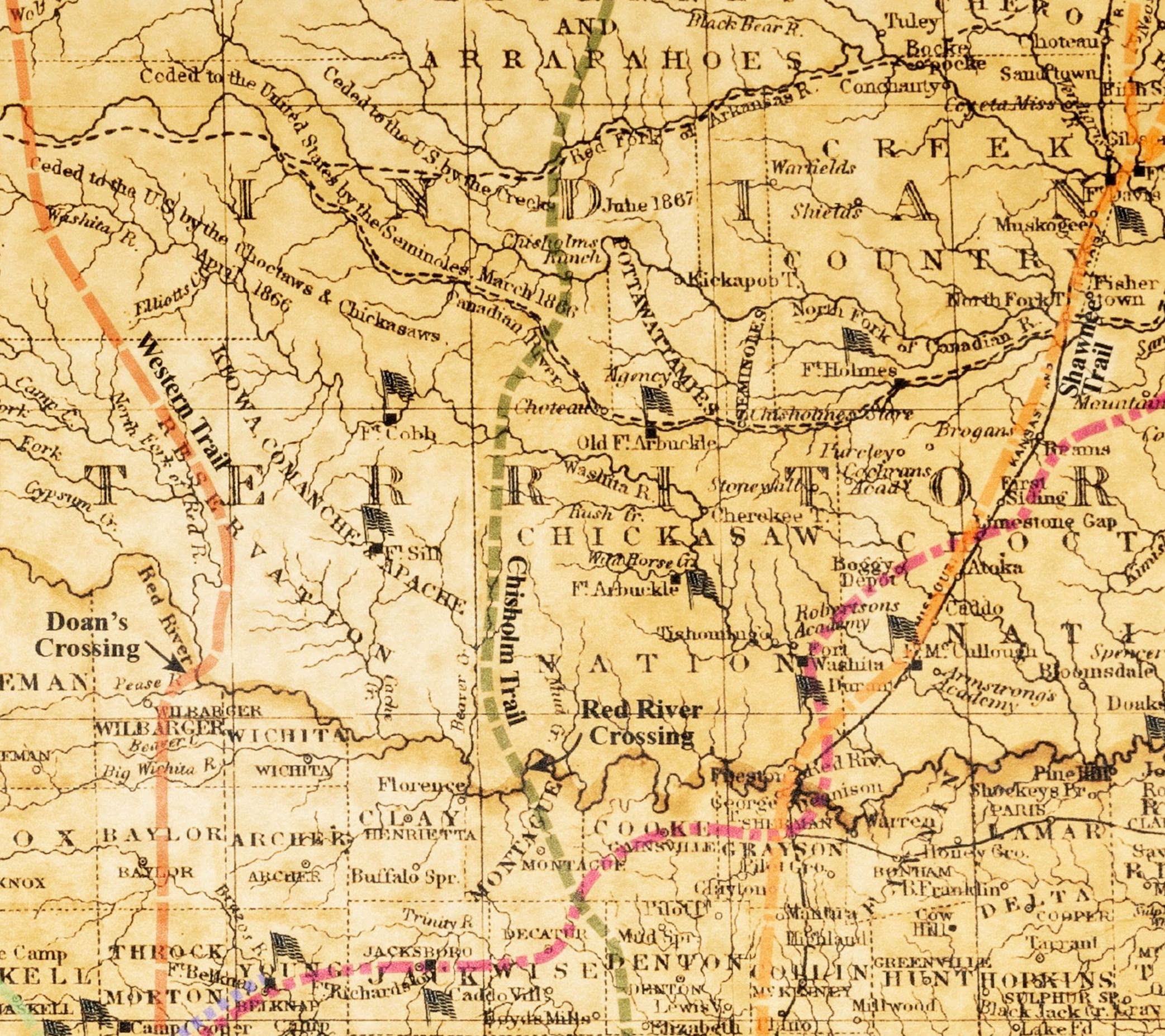 • This beautiful, copyright exclusive design features a stunning 1876 S.A. Mitchell map of Texas overlaid with the Goodnight-Loving, Chisholm, Great Eastern, Great Western, & Shawnee Cattle Trails.