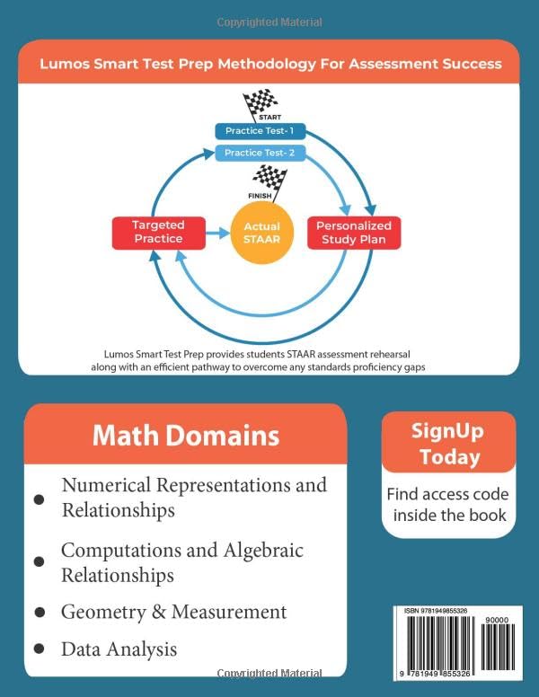Give Your Child an Edge on the 2025 STAAR! Prepare them to excel in the Texas state assessments with confidence and ease. Designed by STAAR experts, the Lumos Learning 6th Grade Math Practice Workbook is crafted to boost your child’s test scores by 10-15 points. Featuring hundreds of practice questions fully aligned with Texas TEKS standards, realistic online practice tests, and personalized learning paths, this workbook is tailored to your child’s needs. What’s New in the 2024-25 Lumos STAAR Grade 6 Math Workbook? Introducing Lumos AI Tutor: Get personalized guided support with step-by-step explanations, helpful hints, and tailored feedback–just like having a teacher at home! Try it today with your workbook. Comprehensive STAAR Prep with 6th Grade Math Practice Questions Expert-Designed Practice: Hundreds of carefully crafted questions aligned with the STAAR test, available in both print and digital formats, covering every essential math concept. Comprehensive Coverage: The workbook addresses 30+ math skills, including Numerical Representations and Relationships, Computations and Algebraic Relationships, Geometry & Measurement, and Data Analysis. Realistic Practice Tests: Prepare your child with two full-length practice tests that mirror the exact format and difficulty level of the STAAR exam, helping them build confidence for test day. Personalized Study Plan: Based on your child’s performance in the online practice tests, receive a personalized study plan, guiding them through targeted remedial practice using the physical workbook. Lumos AI Tutor: Acting as a personal coach, the AI Tutor provides step-by-step guidance, hints, and real-time feedback to keep your child on track and engaged during practice. Progress Tracking: Compare your child’s progress with their peers using easy-to-read performance reports, allowing you to address any learning gaps early. Exclusive Print & Digital Resources What’s Included in the Printed Workbook? Four chapters covering all Texas Math standards Answer keys with detailed explanations Exclusive Online Resources Two full-length practice tests mirroring the 2025 STAAR exam Personalized study plans for targeted remedial practice Engaging test prep resources such as guided practice questions, solved examples, videos, mind maps, flashcubes, and more A user-friendly dashboard with detailed performance reports Lumos AI Tutor for personalized support during practice Why Parents Trust Lumos tedBook for Texas State Tests With over 17 years of experience, Lumos Learning has helped more than 1.3 million students, 164,600 teachers, and 58,100 schools improve their test outcomes. Our Smart Test Prep Methodology ensures your child is fully prepared for the 2025 STAAR. A Workbook Designed for Year-Round Learning Whether for classroom instruction, at-home practice, homeschooling, or tutoring, the Lumos STAAR Math Workbook provides an engaging and effective way to prepare for the Texas state tests. Don’t wait–give your child the advantage they need for the 2025 STAAR with the Lumos tedBook. Order today and start preparing for success!
