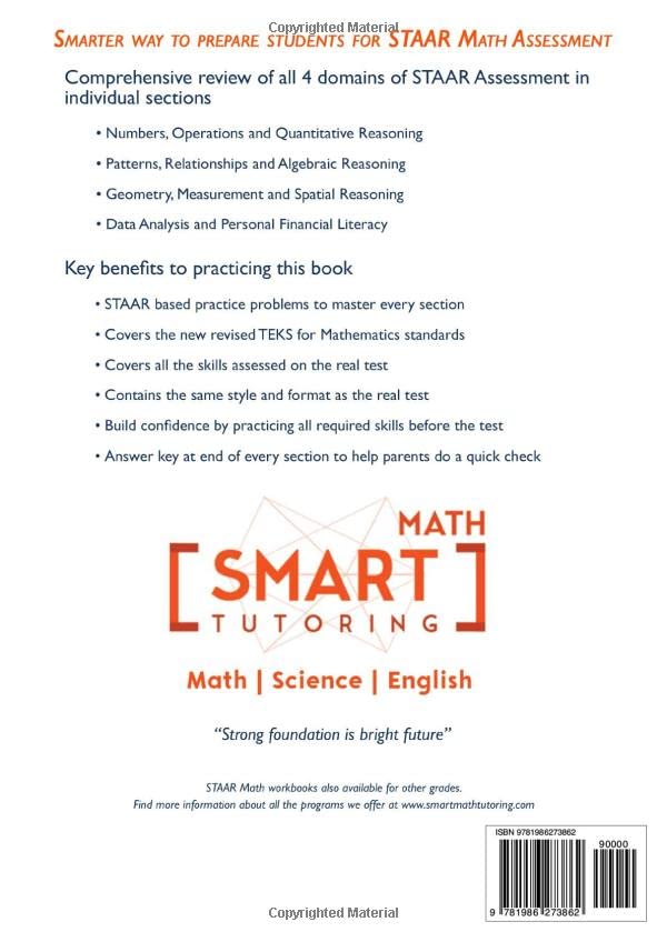 This edition is redesigned to align more closely to the new changes made in STAAR 2022-23, with a variety of new question types in addition to traditional multiple-choice questions. The Wide range of question types included to help students transition to the new online STAAR exam. This practice workbook has more than 375 highest quality real STAAR based problems. The workbook also include 60+ solutions across all sections. This comprehension review is divided into 4 main categories of STAAR Math exam: Numbers, Operations and Quantitative Reasoning Patterns, Relationships and Algebraic Reasoning Geometry, Measurement and Spatial Reasoning Data Analysis and Personal Financial Literacy Key benefits of practicing this book: The 4 individual domains help the parents to identify the main area of Mathematics where child is falling behind STAAR based problems master every section Covers all the skills assessed on the real test Contains the same style and format as the real STAAR test Build confidence by practicing all required skills before the test Covers the new revised TEKS for Mathematics standards There is an answer key at the end of each section to help parents do a quick check.