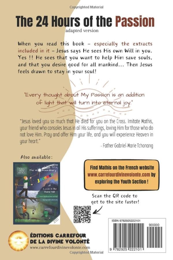 Join Mathis as he follows Jesus during the 24 Hours of the Passion. This book is an adapted version of the book of the 24 Hours of the Passion (Servant of God Luisa Piccarreta’s writings, which received the first Imprimatur in 1914 by Father Saint Hannibal Maria di Francia). This children’s version contains part of the 24 Hours sequence for each stage of Jesus’ Passion journey. Each hour contains a story page, an illustration and an official extract from the 24 Hours of the Passion book, written by Luisa. You’ll appreciate the large, striking illustrations that allow you to meditate more deeply on the mysteries of Our Lord’s Passion. All content is approved by Father Gabriel-Marie Tchonang. For more information: www.carrefourdivinevolonte.com or [email protected]