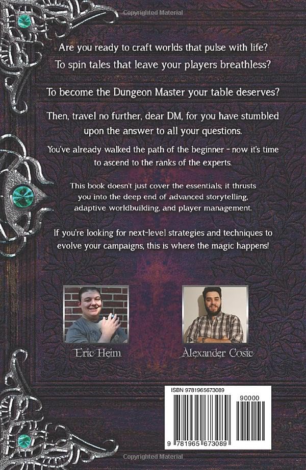 Welcome all Explorers! Are you a Game Master? Want to level up those trusty Dungeon Mastering skills? Have you navigated your party through countless dungeons, only to feel like there’s still more you could do to blow their minds, mastering the basics but craving the power to forge epic, player-driven sagas that echo through the ages? Then, travel no further, dear DM, for you have stumbled upon the answer to all your questions. You’ve already walked the path of the beginner – now it’s time to ascend to the rank of expert. This book doesn’t just cover the essentials; it thrusts you into the deep end of advanced storytelling, adaptive worldbuilding, and player management. If you’re looking for next-level strategies and techniques to evolve your campaigns, this is where the magic happens. In this guide, you’ll… Create living, breathing worlds that evolve alongside your players’ choices. Design epic arcs, plot twists, and act breaks that keep players hooked session after session. Learn advanced storytelling techniques, weaving themes, symbols, and emotional stakes into stories that haunt your players – long after they’ve left the table. Handle unexpected player choices like a pro, adapting on the fly to let their decisions fuel your story. Immersively craft sessions, using atmosphere, props, and pacing to create truly memorable campaigns. Develop your unique DM style and master the art of implementing player feedback. This isn’t a book of simple tricks or surface-level tips. It’s a weapon, a workshop, and a war cry for those who crave more than a good session – who hunger for the extraordinary. If you’re ready to step beyond the DM screenand command your stories like a master, this is the guide that will take you there. This is your call to adventure! Are you ready to craft worlds that pulse with life? To spin tales that leave your players breathless? To become the Dungeon Master your table deserves? Then, pick up this guide and fulfill your destiny!