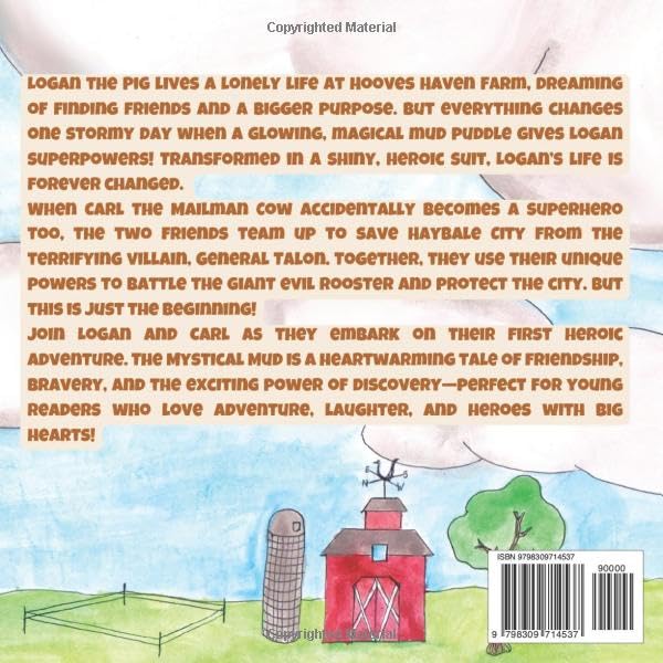 Logan the Pig lives a lonely life at Hooves Haven Farm, dreaming of finding friends and a bigger purpose. But everything changes one stormy day when a glowing, magical mud puddle gives Logan superpowers! Transformed in a sleek, heroic suit, Logan’s life is forever changed. Now, with newfound strength and bravery, Logan is ready for adventure! When Carl the Mailman Cow accidentally becomes a superhero too, the two friends team up to save Haybale City from the terrifying villain, General Talon. Together, they use their unique powers to battle the giant evil rooster and protect the city. But this is just the beginning of Logan’s heroic journey. Will he and Carl be able to face even greater challenges ahead? The Mystical Mud is a heartwarming tale of friendship, bravery, and the exciting power of discovery–perfect for young readers who love adventure, laughter, and heroes with big hearts!