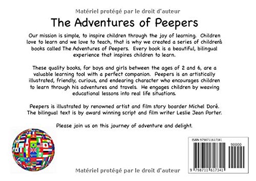 A bilingual book series for children to help them to learn another language as they are entertained by the adventures of a fun loving duckling named Peepers. This is perfect for young readers of any age who are interested in an introduction to another language.Our mission is simple, to inspire children through the joy of learning. Children love to learn and we love to teach, that is why we created a series of children’s books called The Adventures of Peepers. Every book is a beautiful, bilingual experience that inspires children to learn.These quality books, for boys and girls between the ages of 2 and 6, are a valuable learning tool with a perfect companion. Peepers is an artistically illustrated, friendly, curious, and endearing character who encourages children to learn through his adventures and travels. He engages children by weaving educational lessons into real life situations.Peepers is illustrated by renowned artist and film story boarder Michel Dore. The bilingual text is by award winning script and film writer Leslie Jean Porter.
