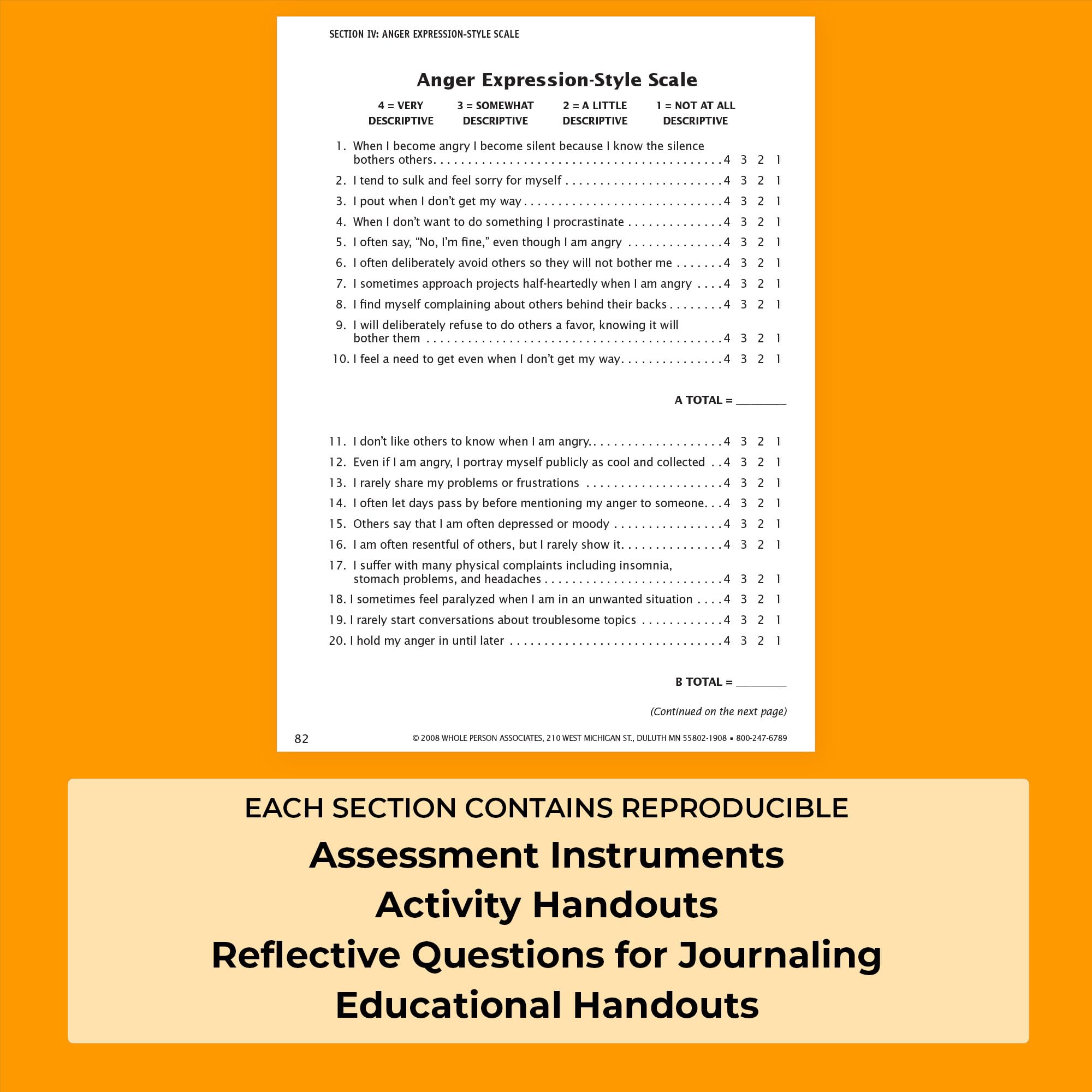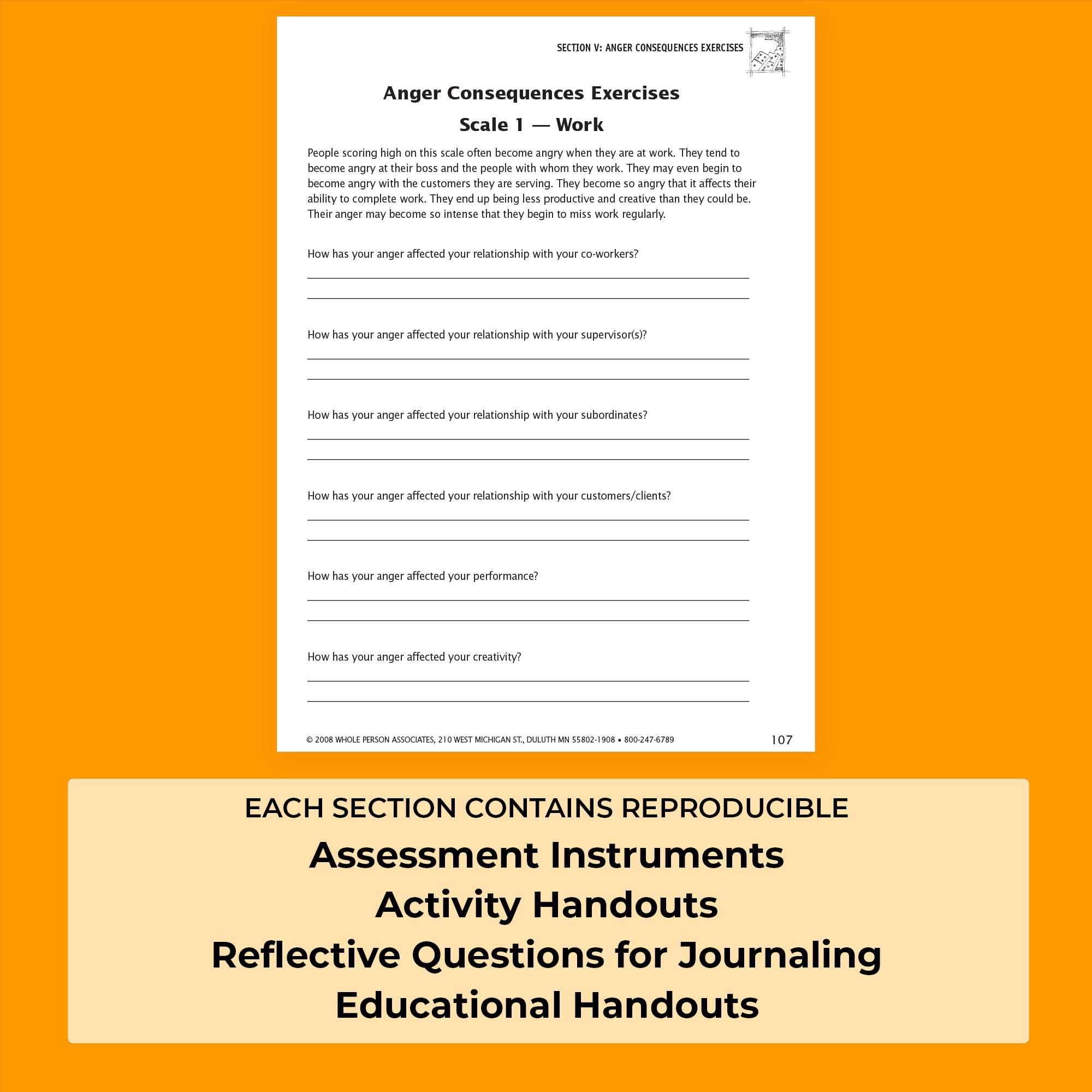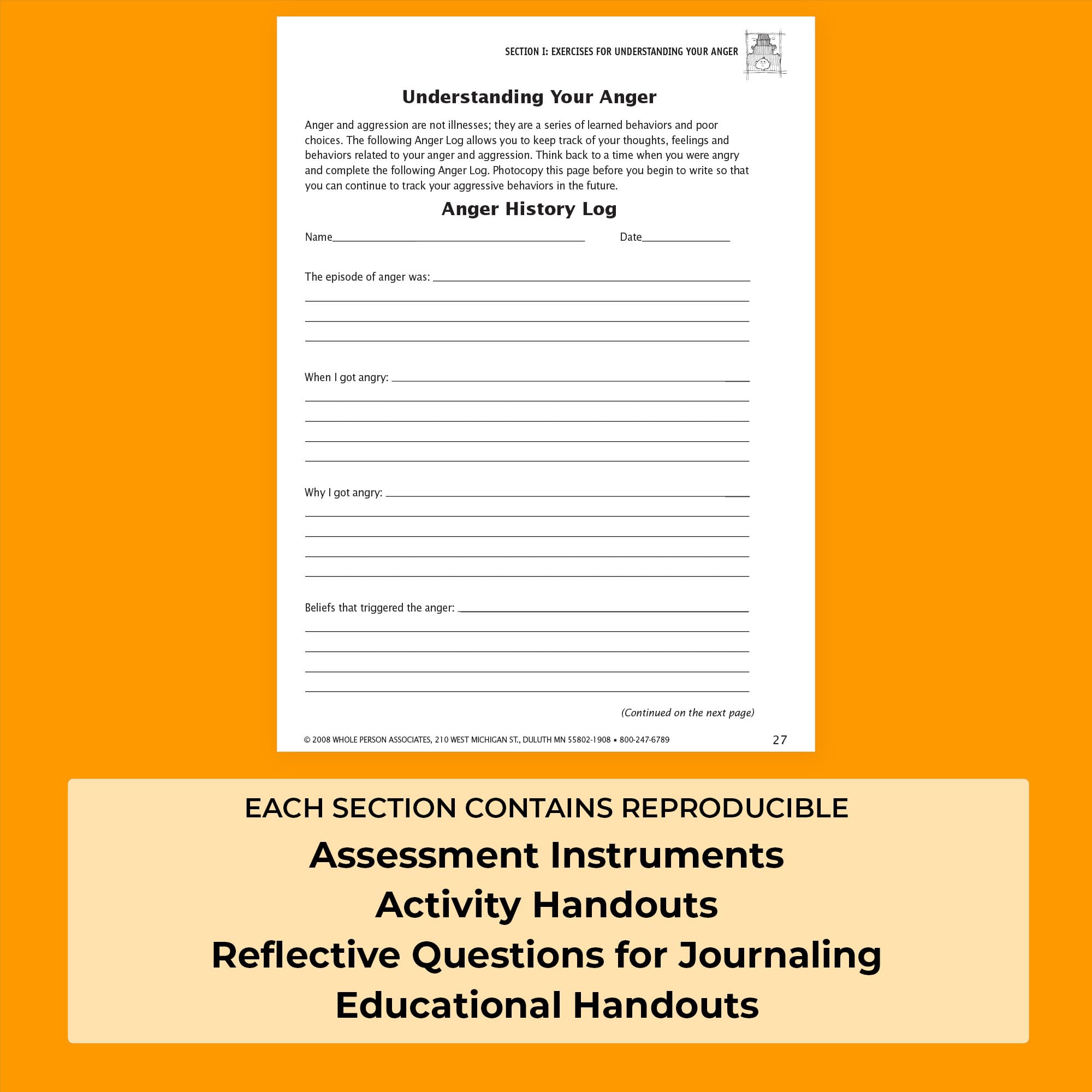 This workbook helps individuals learn how anger and aggression are impacting their lives, and how to make constructive changes, gain insight and learn anger management strategies. Each section of the book contains self-assessment instruments, activity handouts, reflection questions for journaling, and educational handouts – all reproducible. This book is designed as a practical tool for therapists, counselors, psychologists, teachers, and group leaders. Depending on the role of the professional and the group’s needs, each section of the book can be used individually or combined for a more comprehensive approach. The activities can also be self-administered.