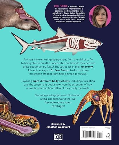 Join children’s author and vet Dr Jess French and explore how animal bodies work, and the amazing things they can do. The Animal Body Book is a friendly introduction to animal anatomy, perfect for any child fascinated by animals or budding veterinarians. With nine chapters covering skeletons, circulation, digestion, the senses and more, every aspect of anatomy is covered, all clearly explained by animal expert Dr Jess French. Animals perform extraordinary feats every day, from breathing underwater to flying, but how do they do these amazing things? The answers lie in the miraculous forms and features of their bodies. This fascinating animal anatomy book for kids offers: – Detailed but child-friendly illustrations of animal biology on every page. – Information by animal expert and children’s TV presenter Jess French. – First of its kind material focusing on animal biology for children aged 5-9. – 9 chapters which break down different anatomy, covering: skeletons, muscles, circulation, breathing, digestion, the senses, reproduction, skin, and invertebrates. From a whale’s enormous heart and an owl’s sensitive ears, to a tortoise’s tough shell and an insect’s unusual eyes, explore more than 40 animal adaptations in close detail. Vivid photography combined with annotated illustrations reveal what each species looks like inside, and colorful diagrams help support children’s understanding of animal anatomy.