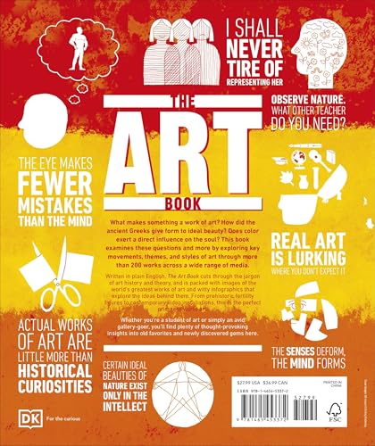 Learn about key movements like impressionism, cubism and symbolism in The Art Book. Part of the fascinating Big Ideas series, this book tackles tricky topics and themes in a simple and easy to follow format. Learn about Art in this overview guide to the subject, great for novices looking to find out more and experts wishing to refresh their knowledge alike! The Art Book brings a fresh and vibrant take on the topic through eye-catching graphics and diagrams to immerse yourself in. This captivating book will broaden your understanding of Art, with: – More than 80 of the world’s most remarkable artworks – Packed with facts, charts, timelines and graphs to help explain core concepts – A visual approach to big subjects with striking illustrations and graphics throughout – Easy to follow text makes topics accessible for people at any level of understanding The Art Book is a captivating introduction to painting, drawing, printing, sculpture, conceptual art, and performance art – from ancient history to the modern day – aimed at adults with an interest in the subject and students wanting to gain more of an overview. Here you’ll discover more than 80 of the world’s most groundbreaking artworks by history’s most influential painters, sculptors and artists, through exciting text and bold graphics. Your Art Questions, Simply Explained This fresh new guide examines the ideas that inspired masterpieces by Van Gogh, Rembrandt, Klimt, Matisse, Picasso, and dozens more! If you thought it was difficult to learn about the defining movements, The Art Book presents key information in an easy to follow layout. Find out about subject matters, techniques, and materials, and learn about the talented artists behind the great works, through fantastic mind maps and step-by-step summaries. The Big Ideas Series With millions of copies sold worldwide, The Art Book is part of the award-winning Big Ideas series from DK. The series uses striking graphics along with engaging writing, making big topics easy to understand.