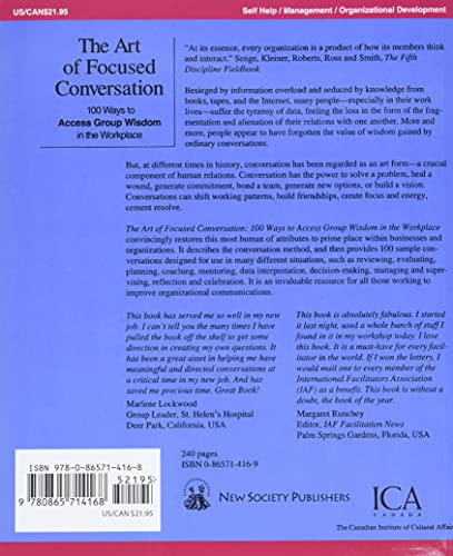 The best ‘how-to’ for encouraging consensus in firms and organizations. Communication within many organizations has been reduced to email, electronic file transfer, and hasty sound bytes at hurried meetings. More and more, people appear to have forgotten the value of wisdom gained by ordinary conversations. The Art of Focused Conversation convincingly restores this most human of attributes to prime place within businesses and organizations, and demonstrates what can be accomplished through the medium of focused conversation. Developed, tested, and extensively used by professionals in the field of organizational development, The Art of Focused Conversation is an invaluable resource for all those working to improve communications in firms and organizations.
